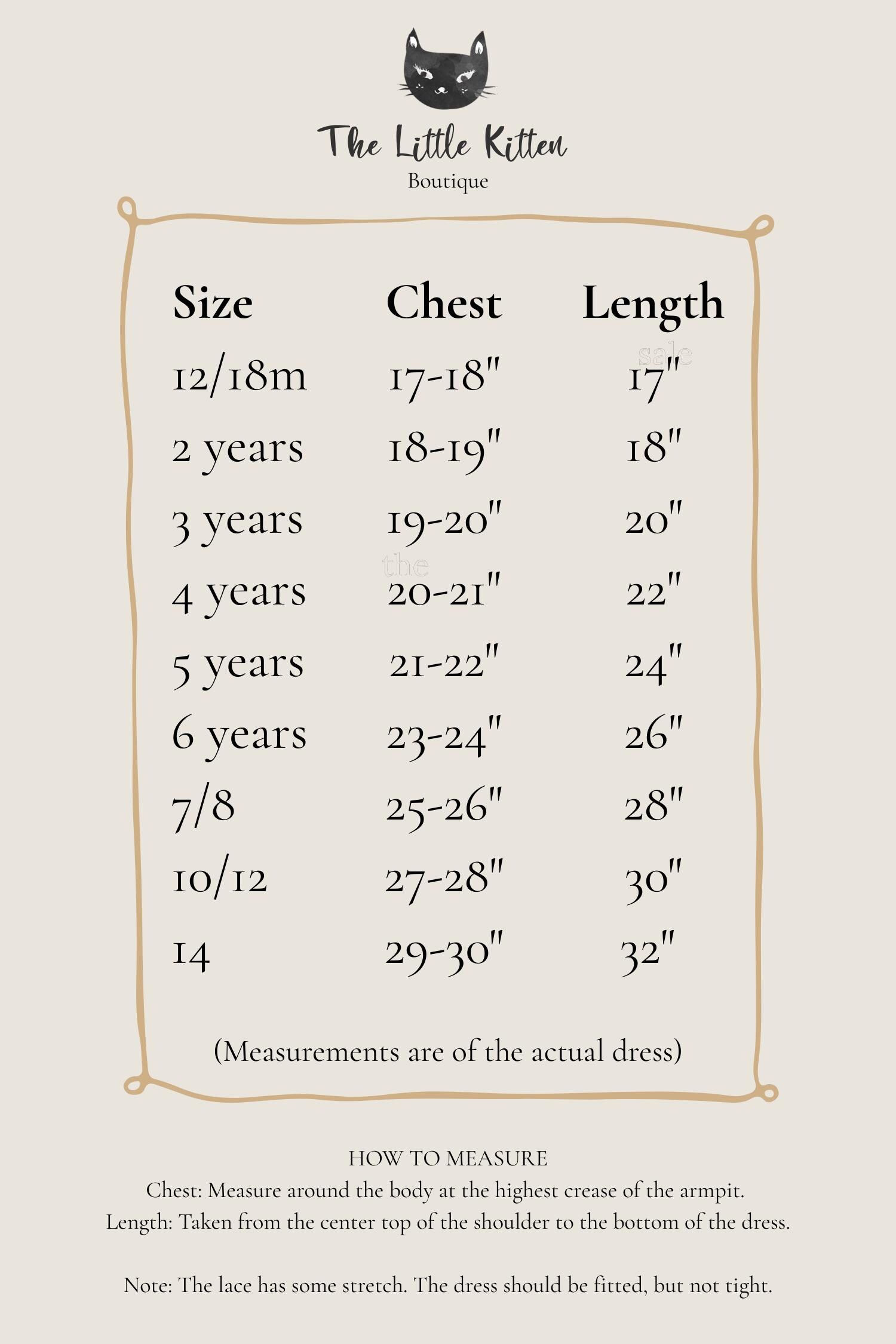 A size chart located within the description of each listing, w/ instructions on how to measure your child. Please keep in mind, what might be floor length on some, can be ankle or above on others and that really depends on the height of the child. And the same for the shorter lengths. Pictures show how the dress generally fits. We request that you measure your child and compare our measurements to those of your child, to select the most accurate size.