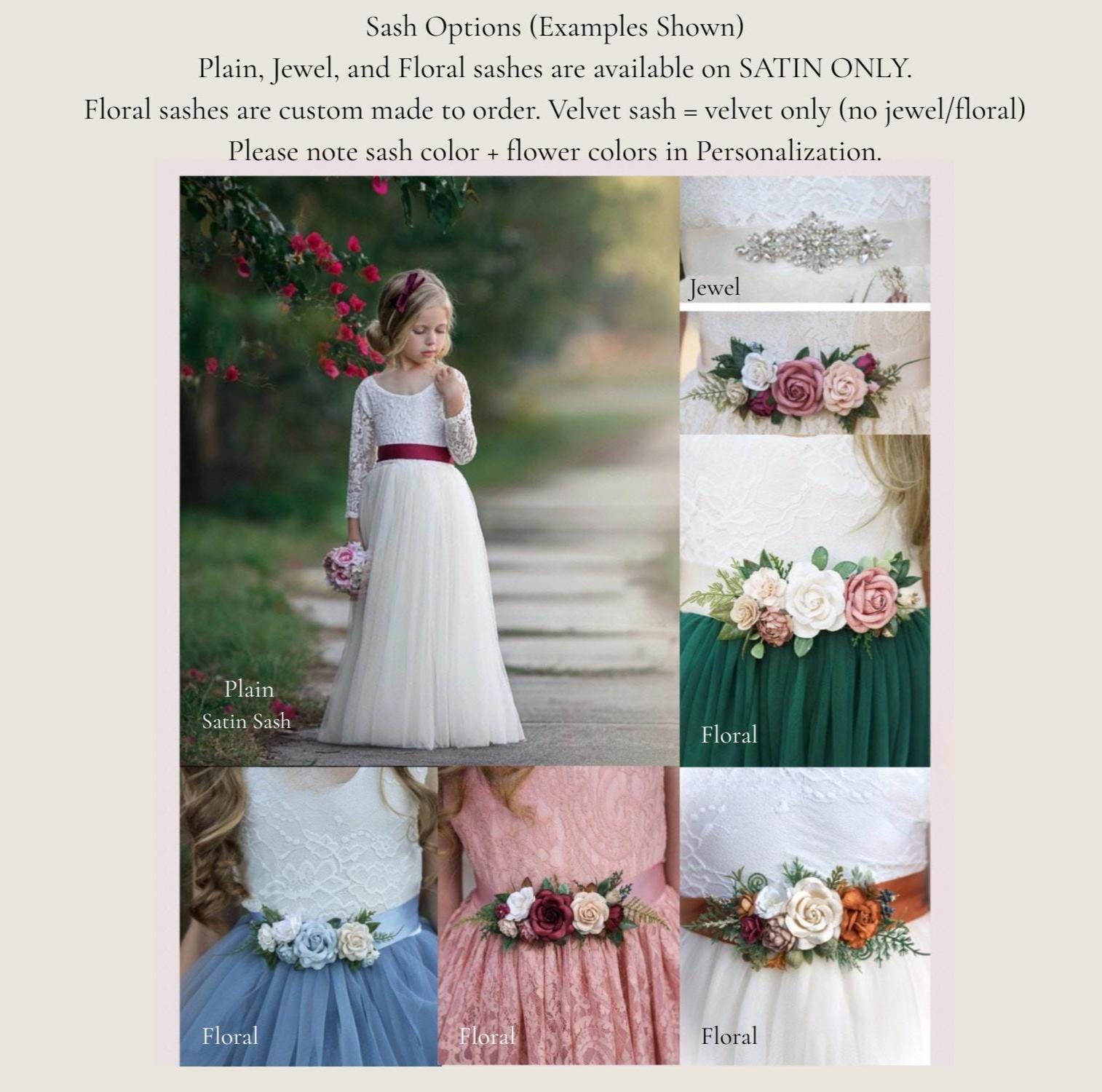 – Plain satin sash for classic elegance