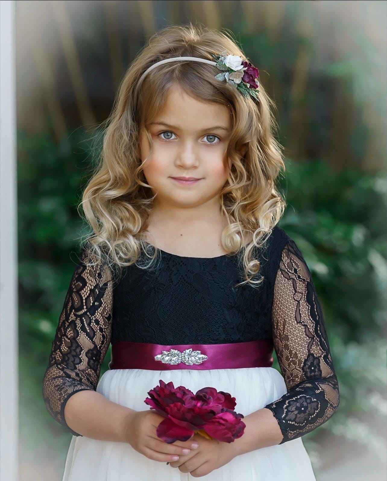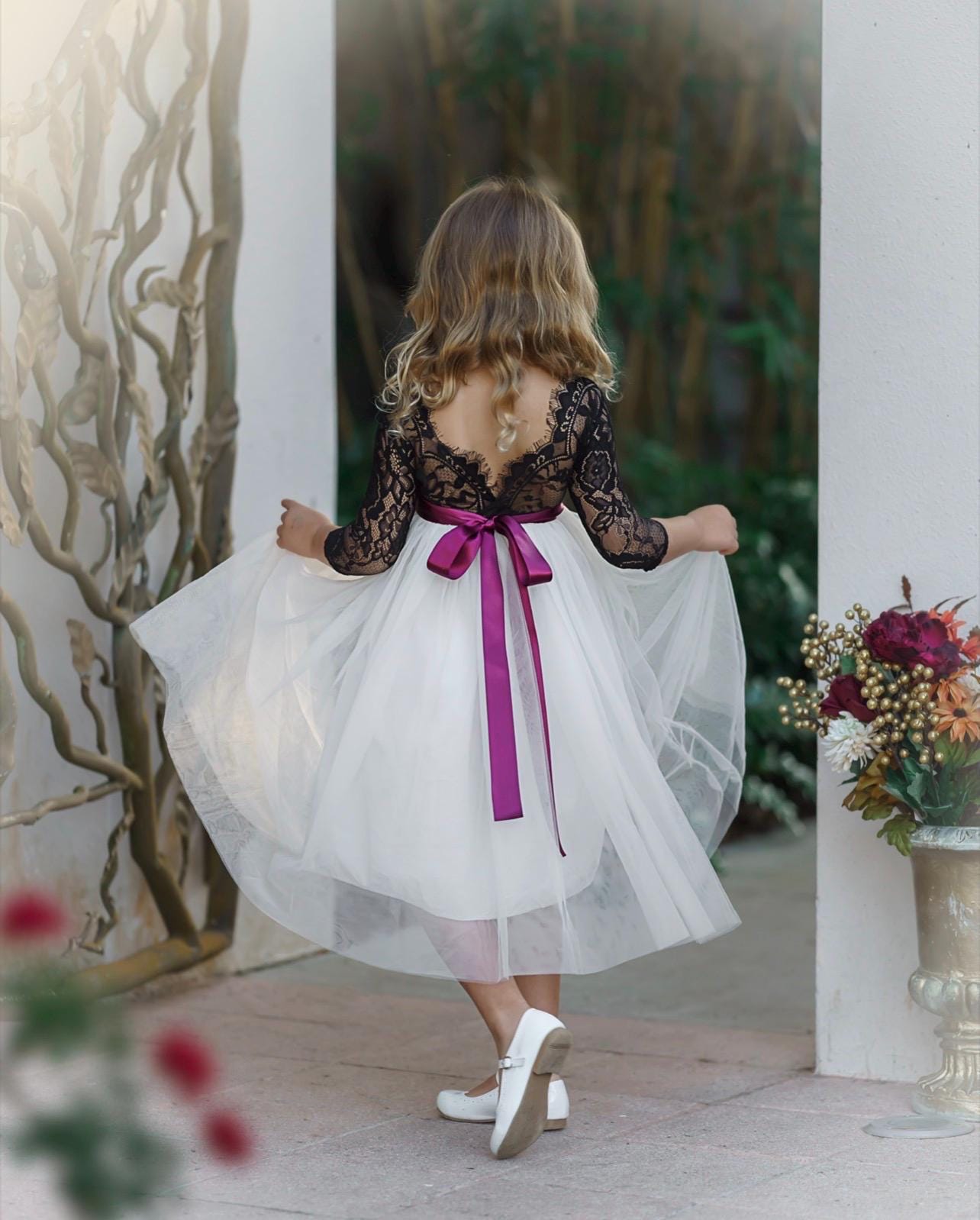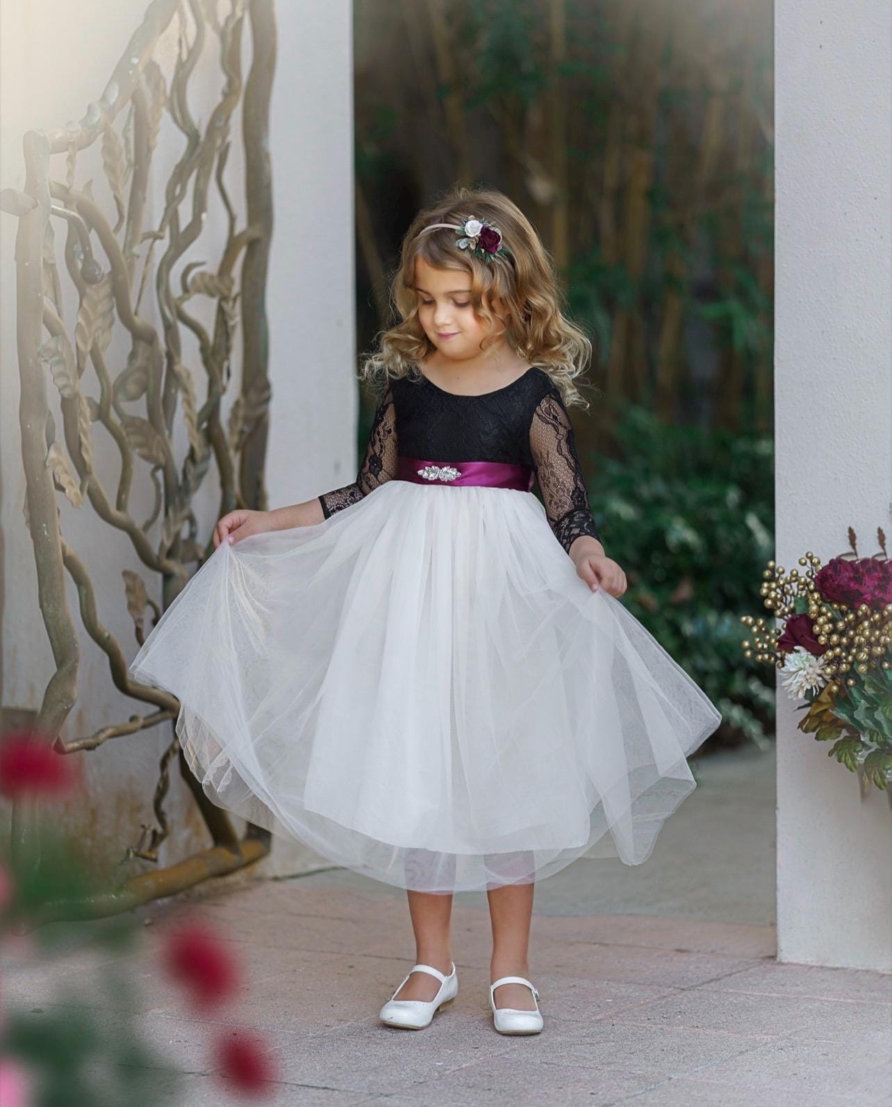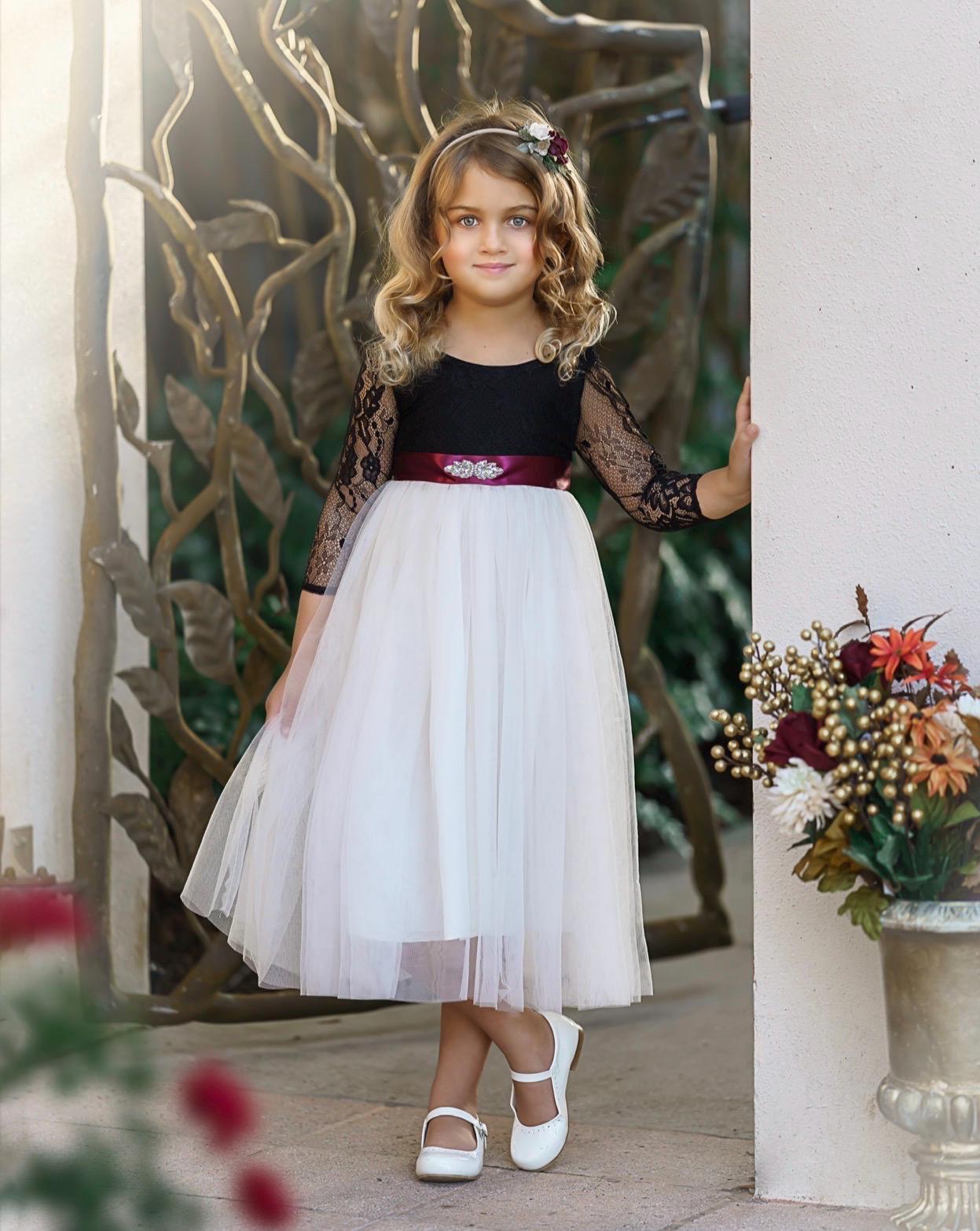This black lace flower girl dress features a soft sweet-cream tulle skirt and long sleeves, creating an elegant look perfect for weddings, portraits, and special occasions.