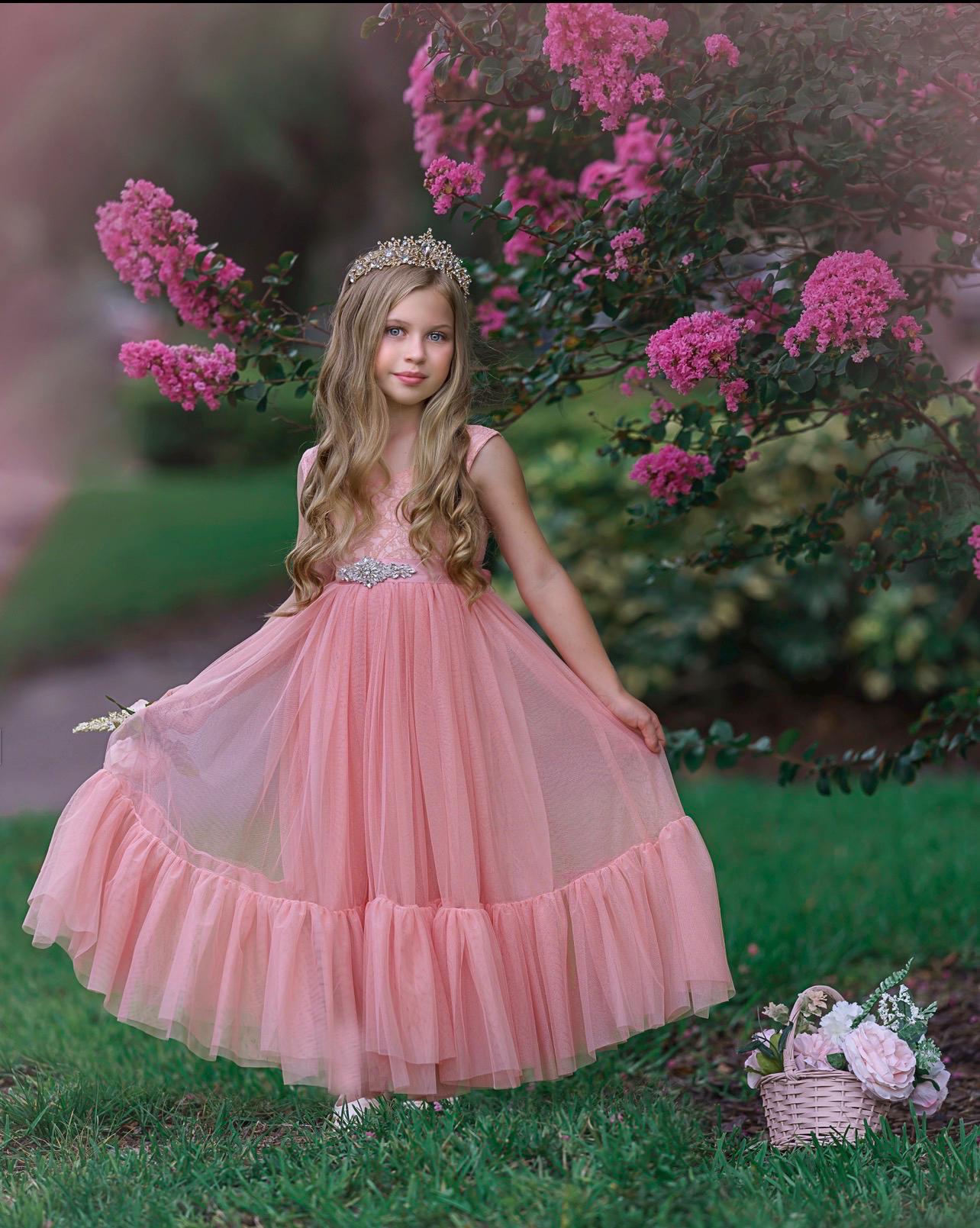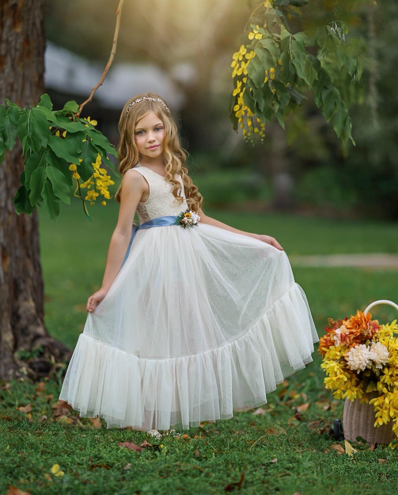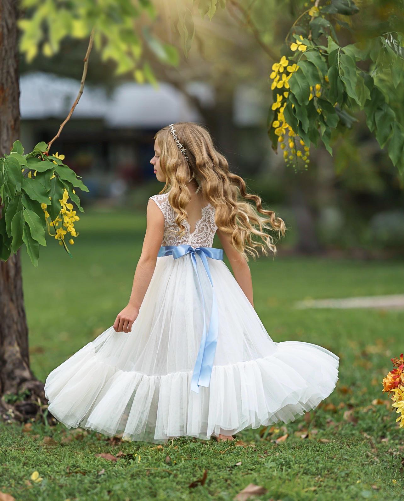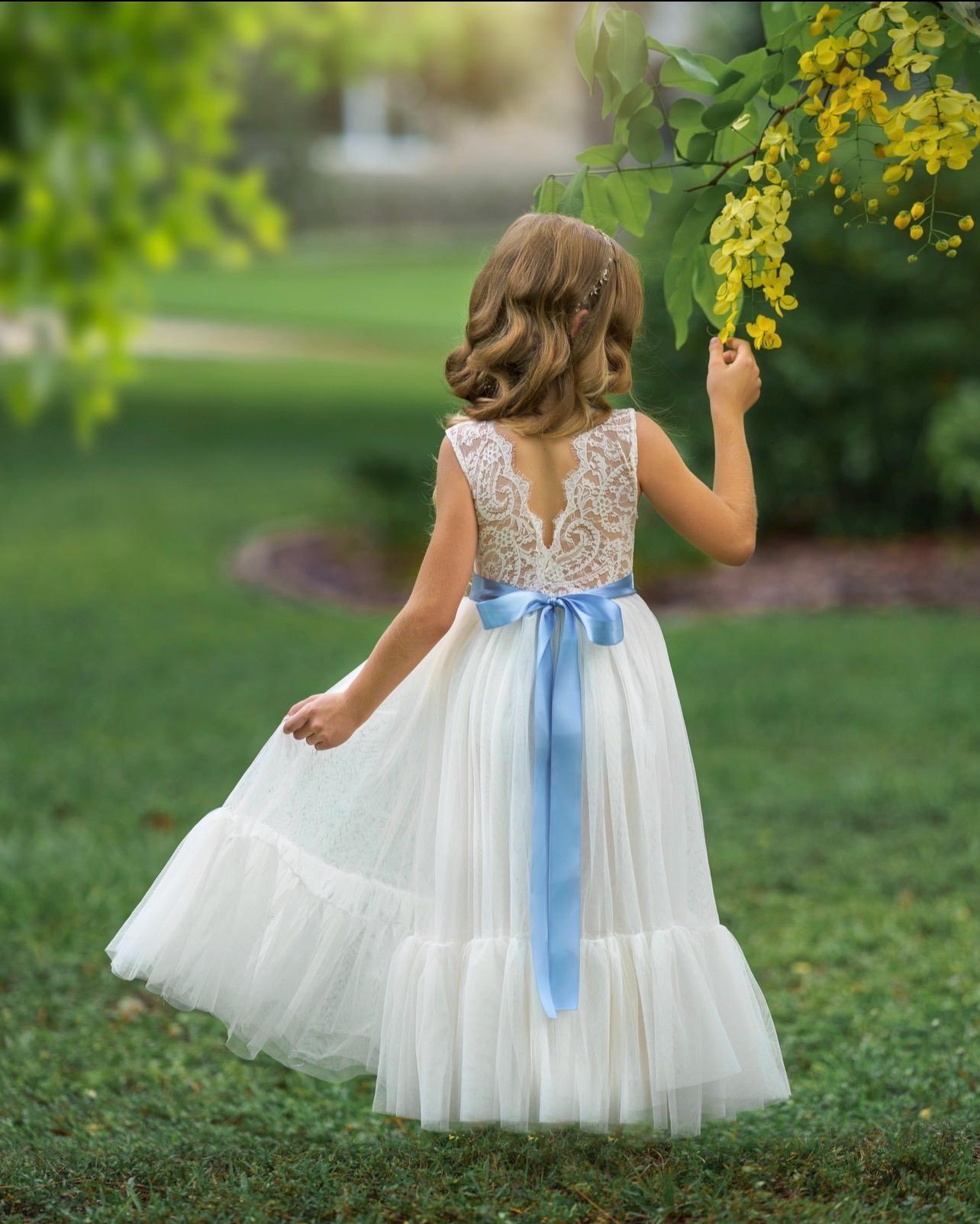 Our enchanting sleeveless tulle flower girl dress, is made with a delicate lace bodice and choice of (3) fully lined, tulle colors: Rose, Sweet Cream or White. Works great for that boho style wedding or beach wedding. We have added a mermaid stye layer to the bottom of the dress for a little extra volume, which make this dress perfect for twirling. Makes a great toddler flower girl dress or junior bridesmaid dress. The V shaped back with scalloped lace edging, adds the perfect amount of boho chic look to this amazing dress. This dress is versatile for any season or event, but perfect for flower girl dresses, photo shoots, daddy daughter dances, baptism and any other special event, she will sure to be the star of the show.