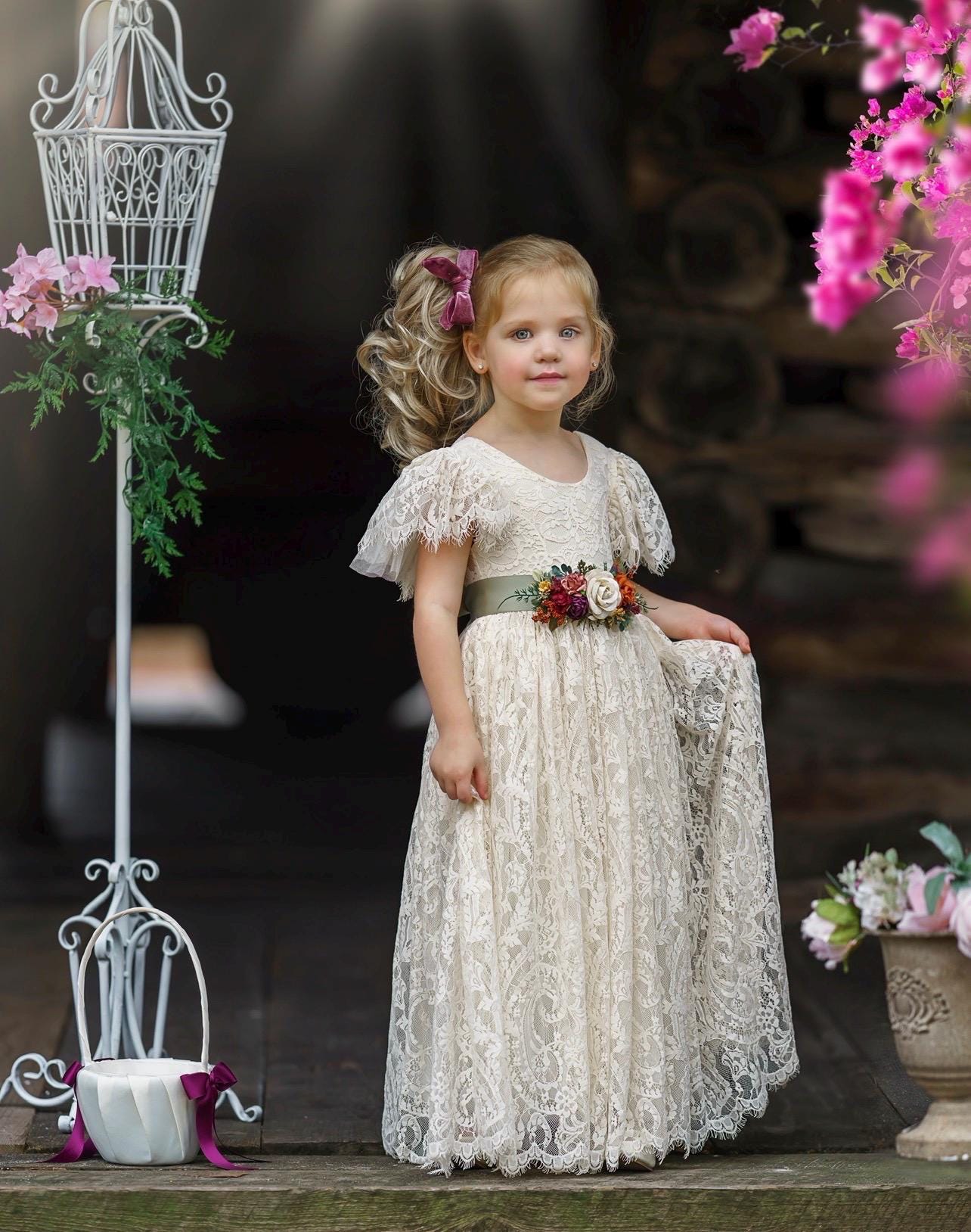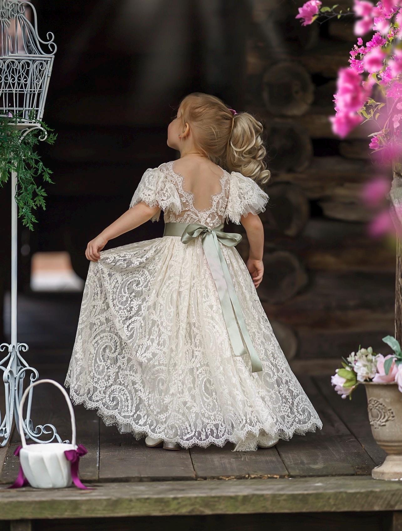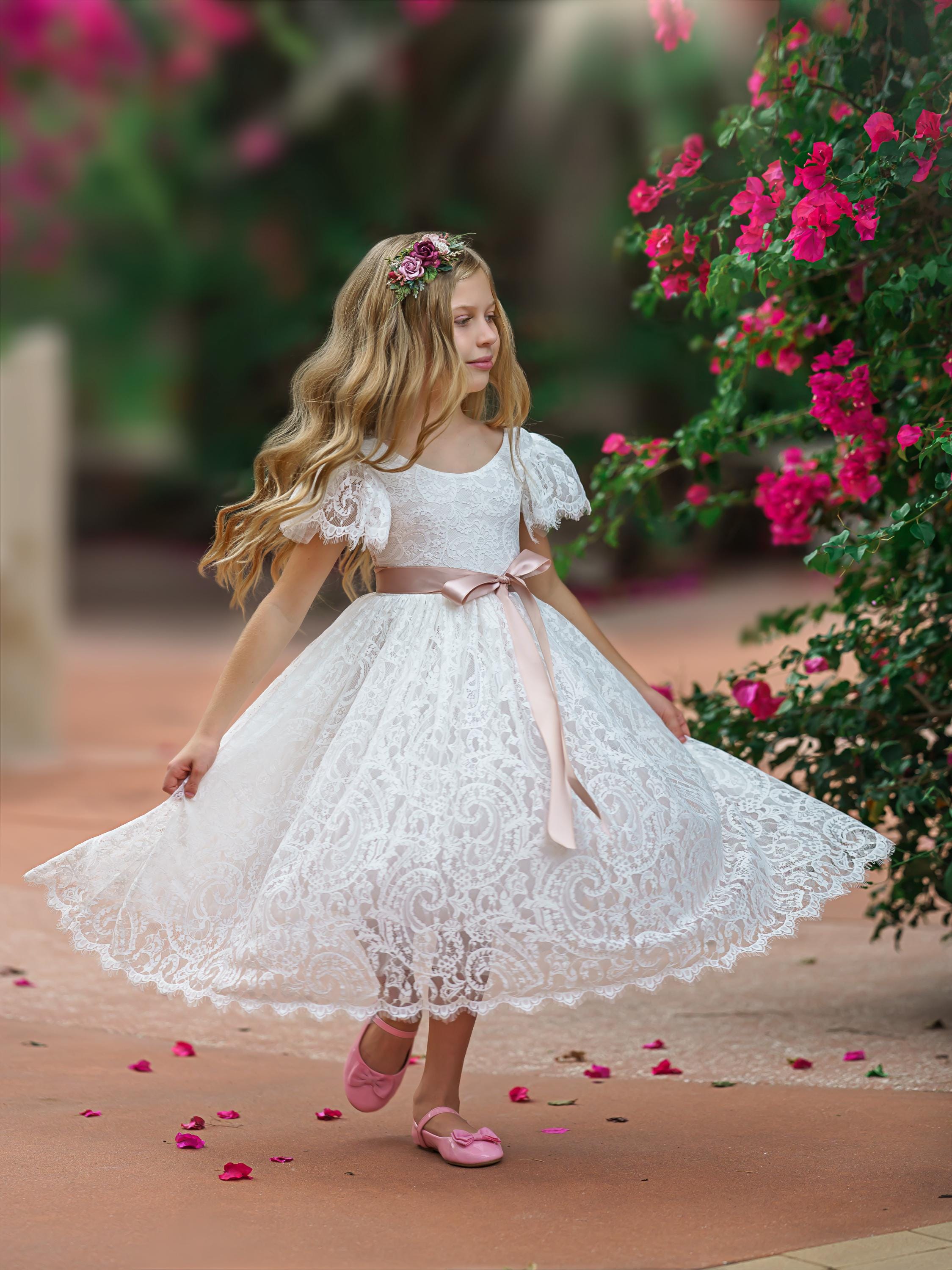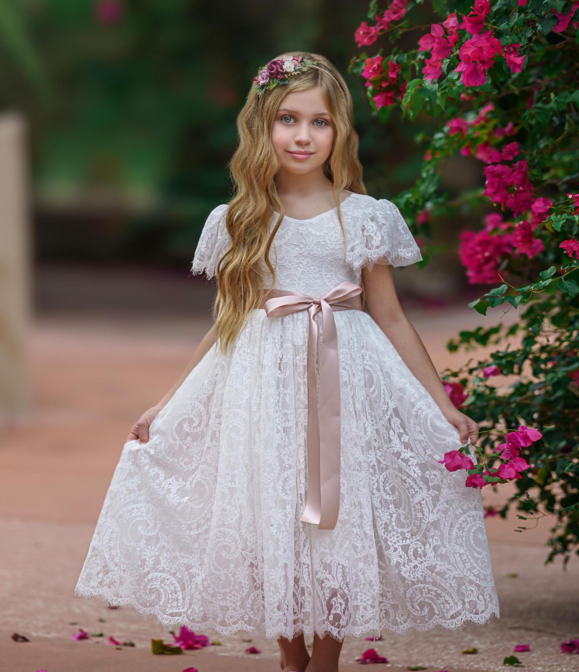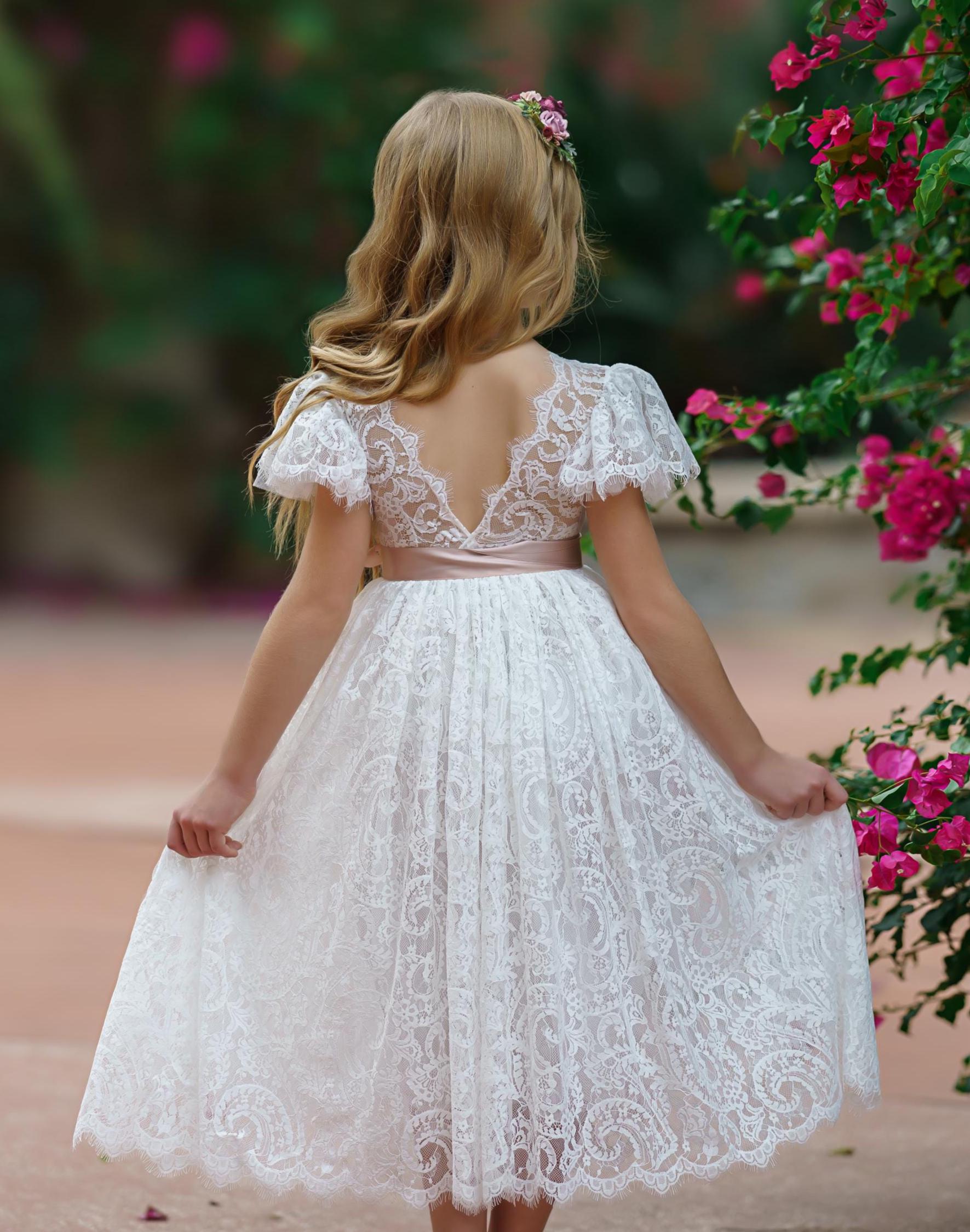 Our enchanting bohemian inspired, ruffle sleeve, lace flower girl dresses are made with a soft lace fabric and fully lined. These stunning dresses are available in (5) amazing colors and are heirloom quality .The lace has an elegant, almost paisley design and is perfectly matched with one of our gorgeous flower sashes and simple satin bow. The V shaped backside, is edged with eyelash lace adds a bit of whimsy to this beautiful dress. These dresses make perfect flower girl dresses, birthday dresses, great for photo shoots or simply to be an everyday princess. SIZE CHART BELOW