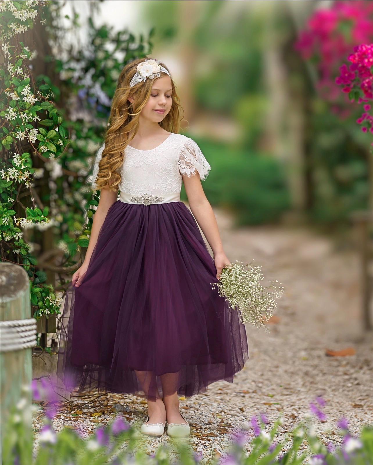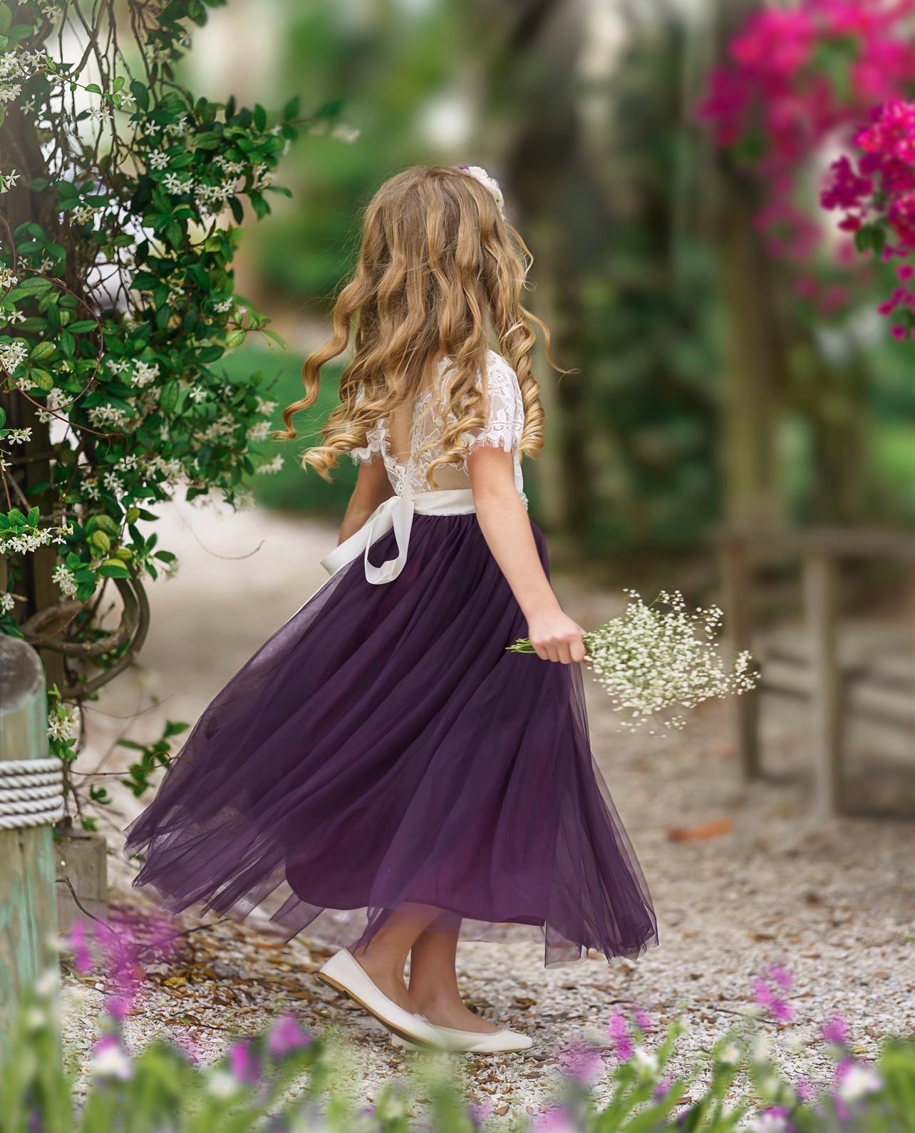 Our stunning butterfly sleeve, Eggplant purple tulle and soft white lace, flower girl dress is the perfect choice for any style wedding or special occasion. This enchanting dress is made with a delicate soft white (off white) lace bodice and fully lined tulle skirting. The V shaped back with unfinished lace adds the perfect amount of boho chic look to this amazing dress.