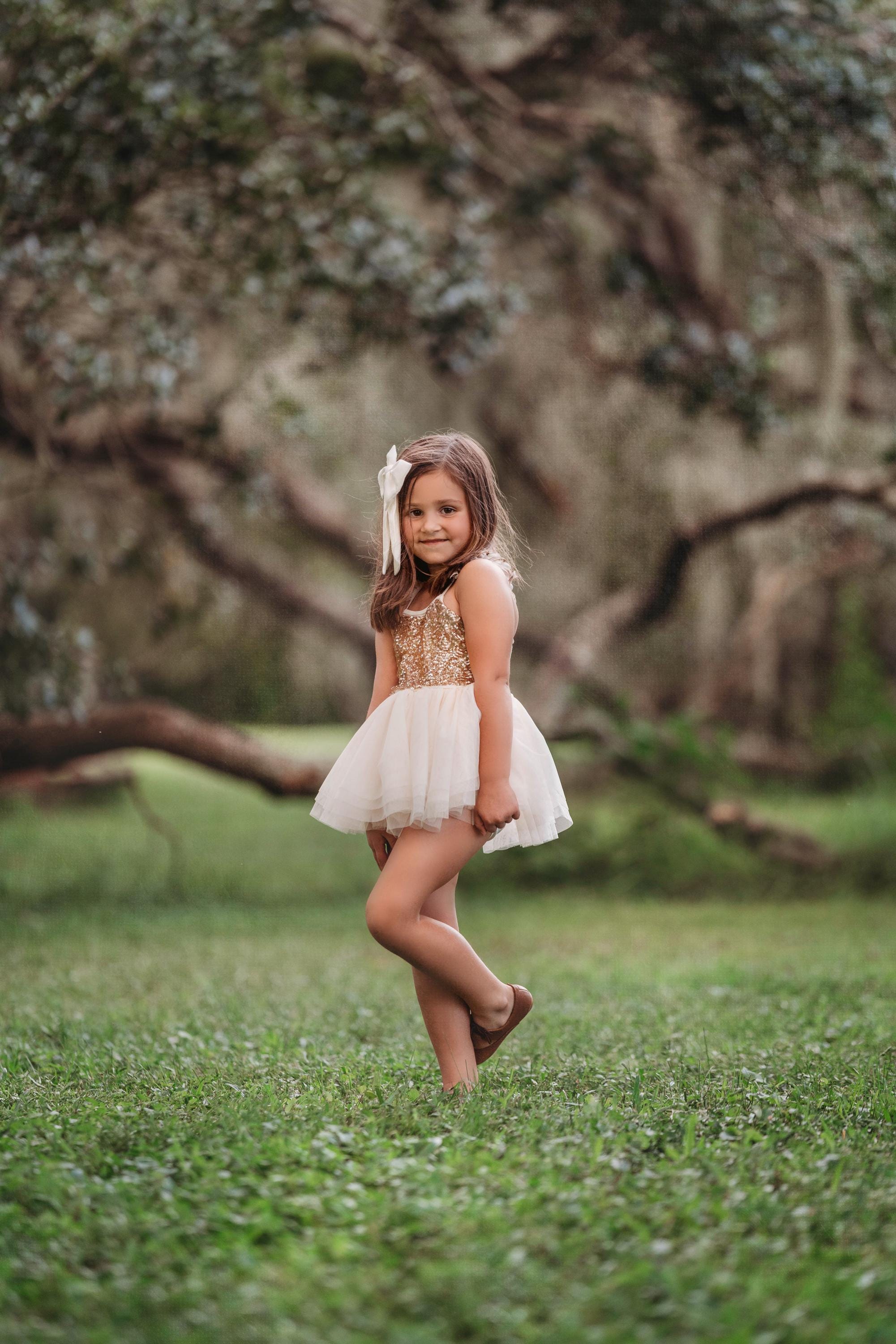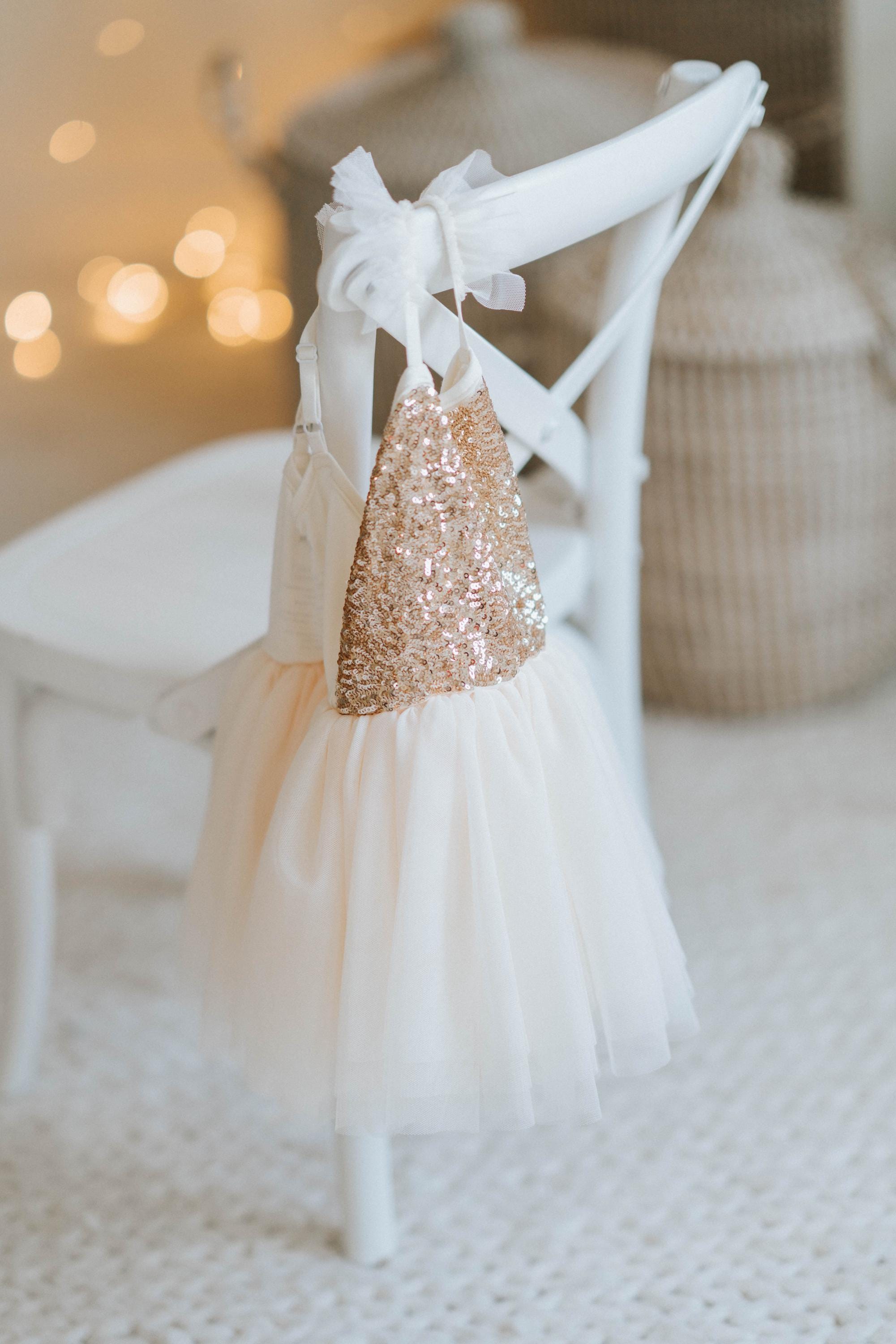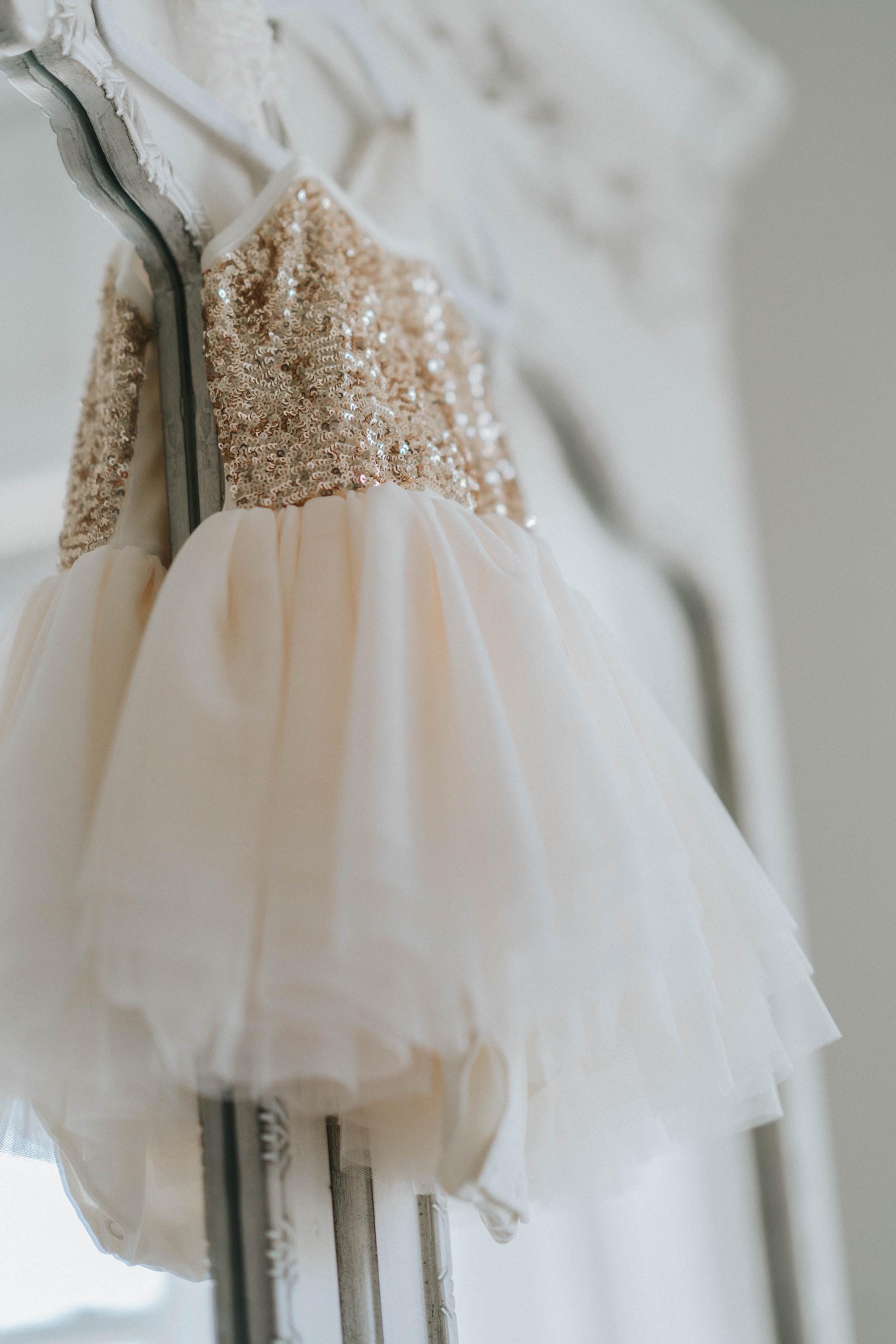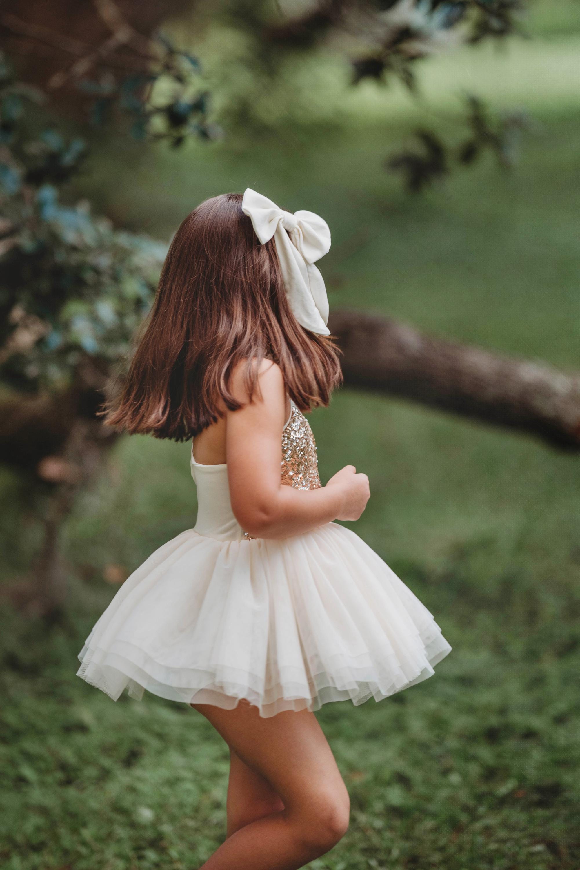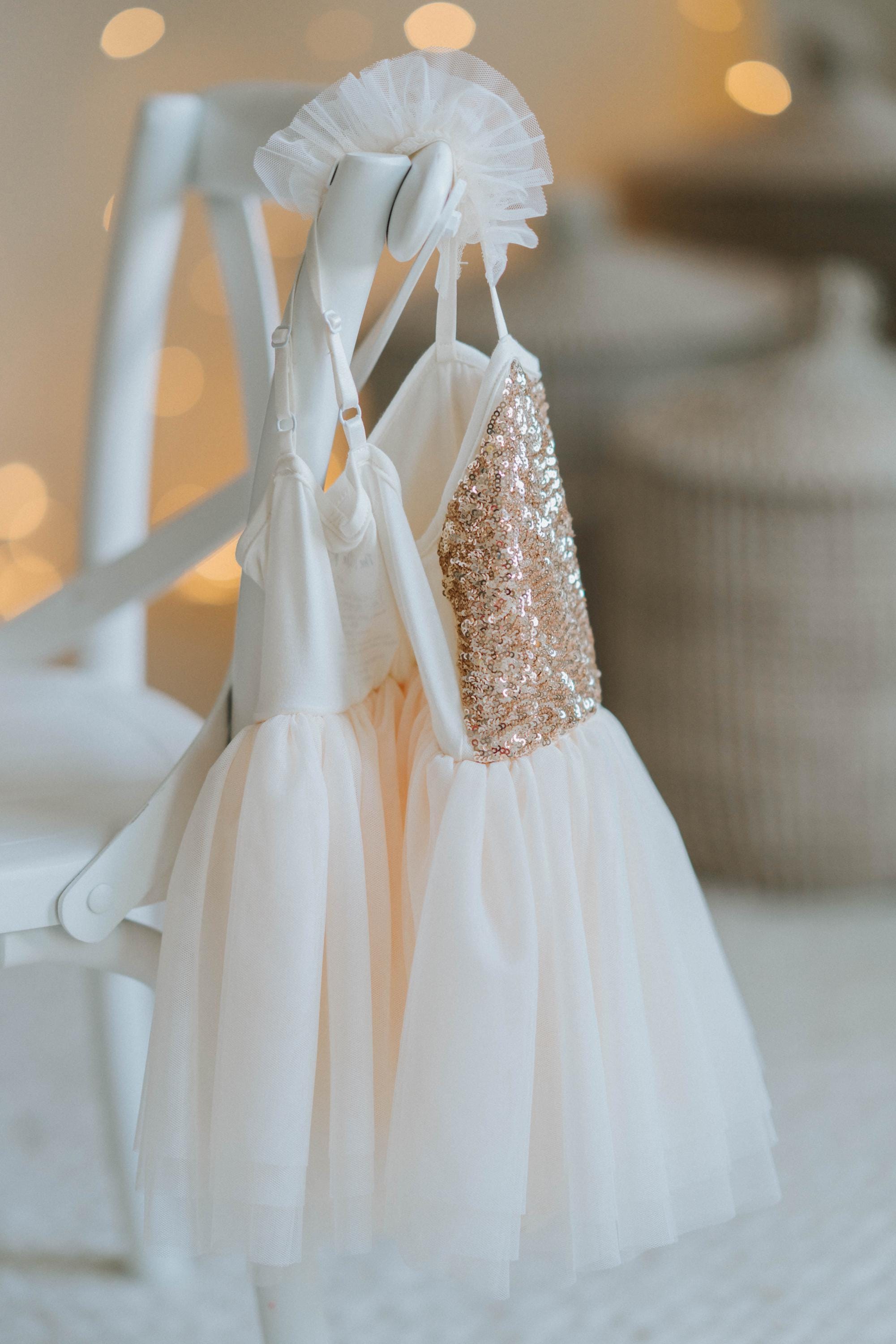 A timeless heirloom piece designed for ballet class, birthdays, holidays, photo shoots, special events, and everyday dress-up play. The bodice features shimmering gold sequins with soft tulle shoulder ruffle detailing. The layered tutu skirt has beautiful volume without stiffness, and the bodysuit base is made from our buttery-soft bamboo knit for all-day comfort. Adjustable straps ensure a perfect fit, and the snap closure makes changes simple.