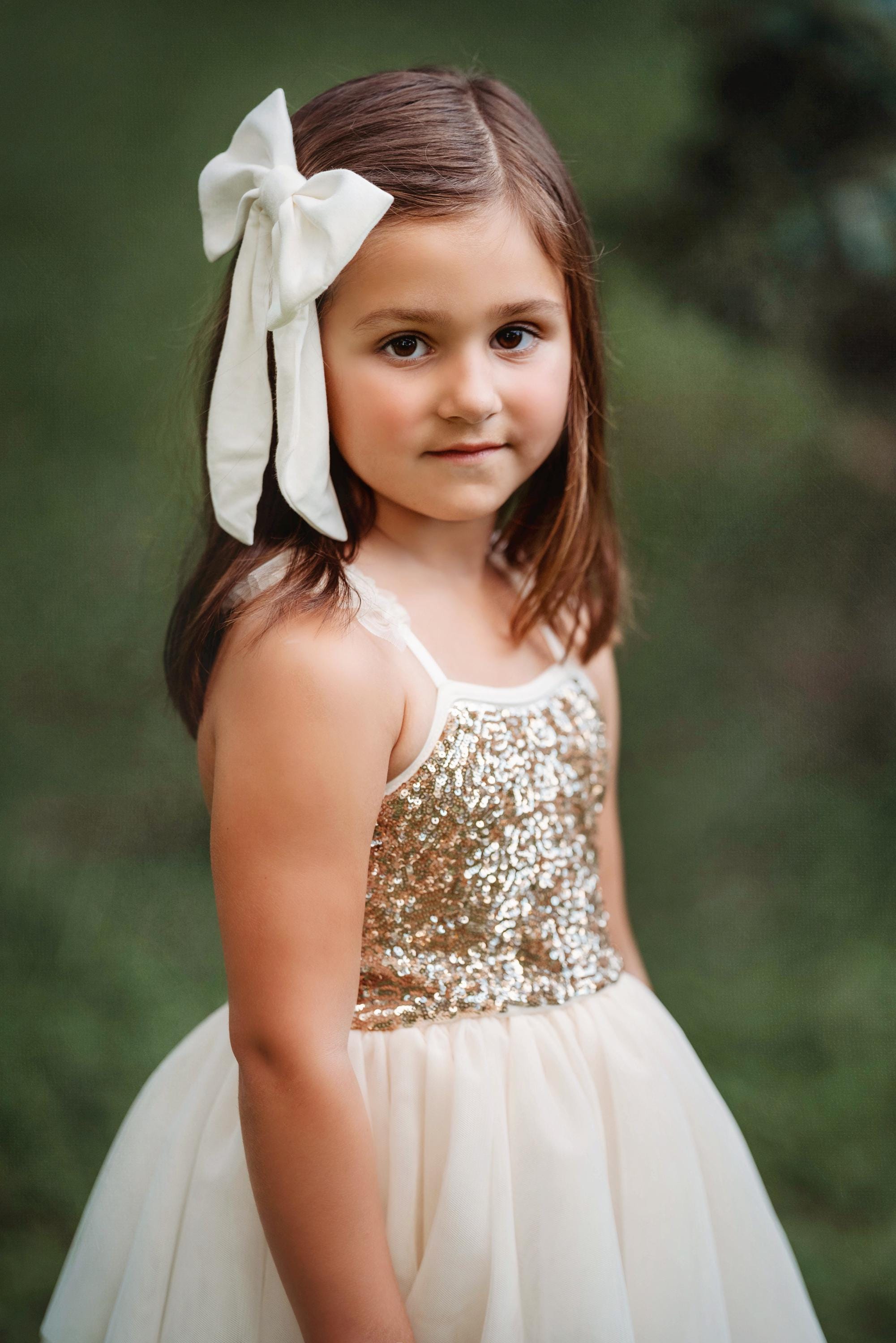 A size chart located within the description of each listing, w/ instructions on how to measure your child. Please keep in mind, what might be floor length on some, can be ankle or above on others and that really depends on the height of the child. And the same for the shorter lengths. Pictures show how the dress generally fits. We request that you measure your child and compare our measurements to those of your child, to select the most accurate size.