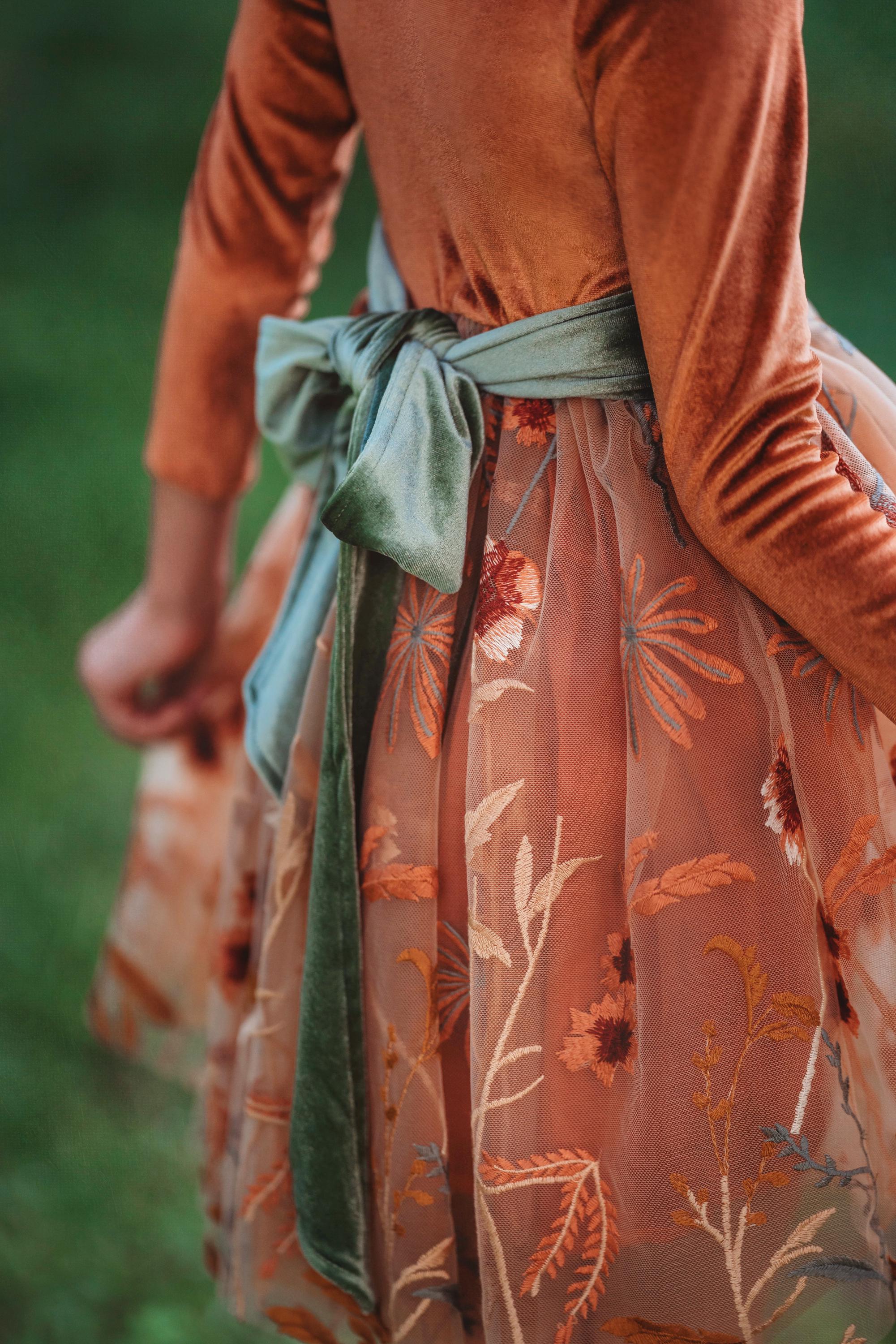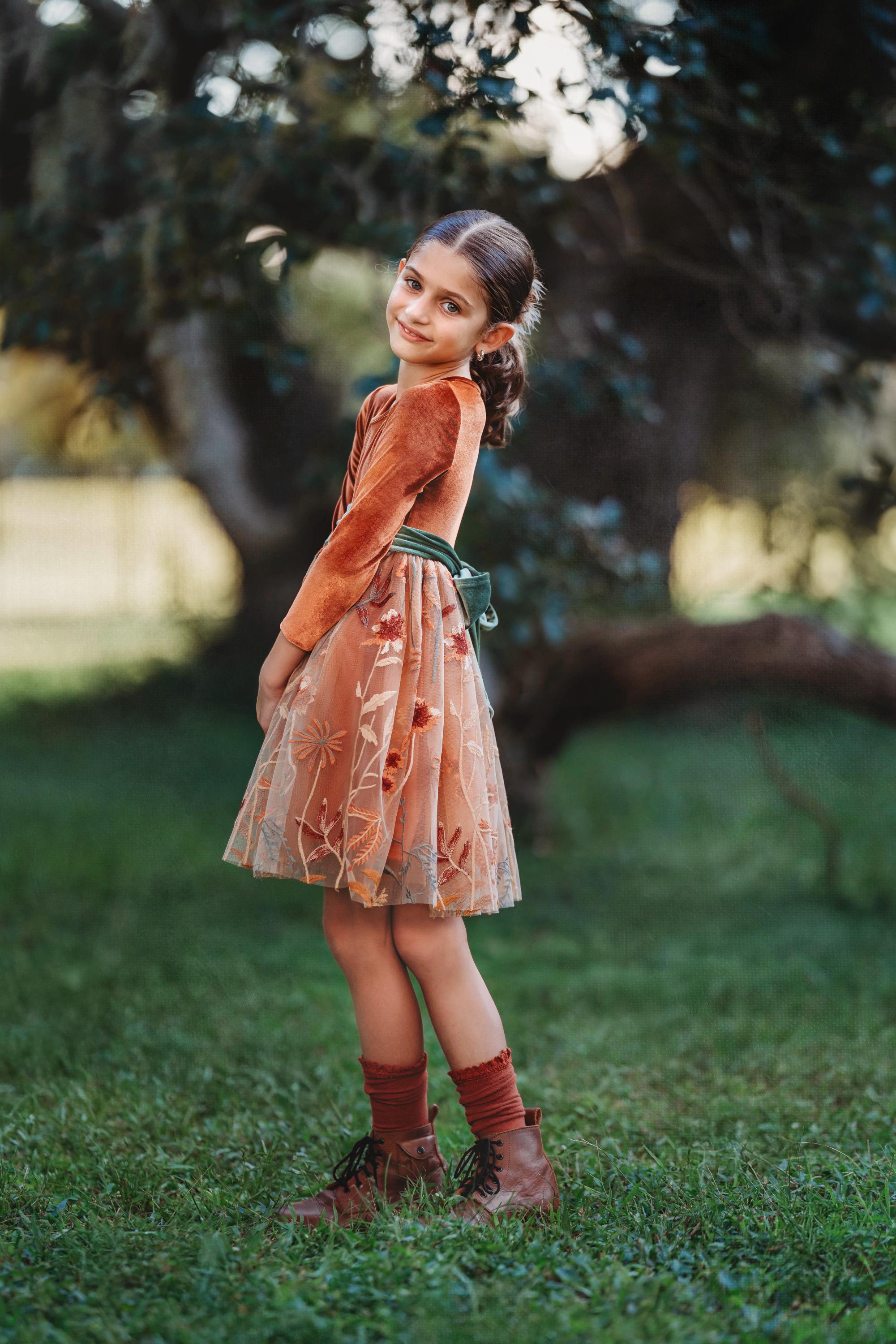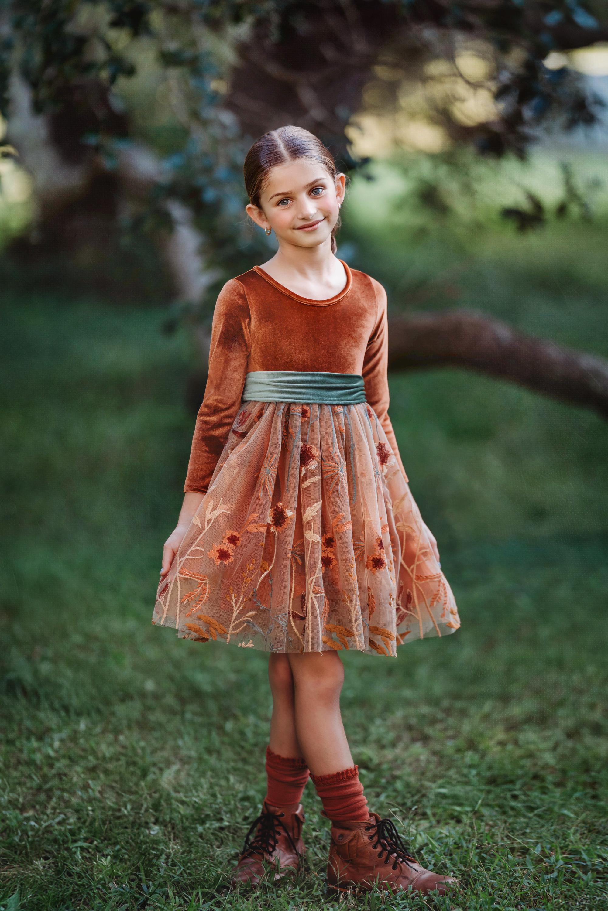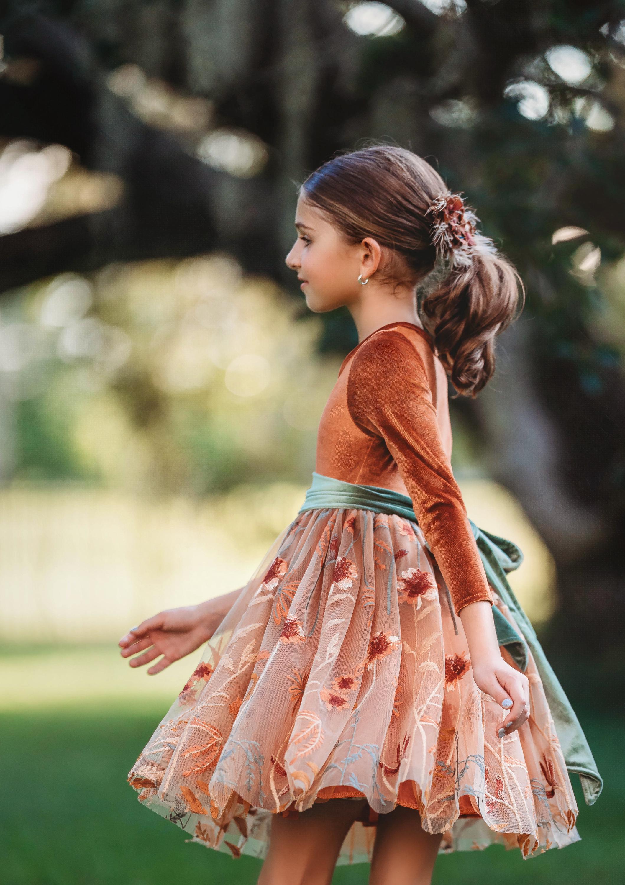 This dress features a soft, stretch velvet bodice in rich burnt orange paired with a full embroidered tulle skirt showcasing warm autumn florals. The wide sage waistband creates a beautifully shaped and comfortable fit.