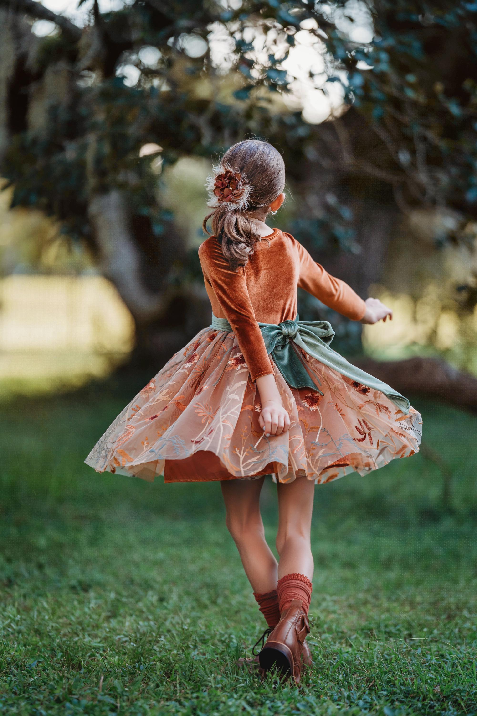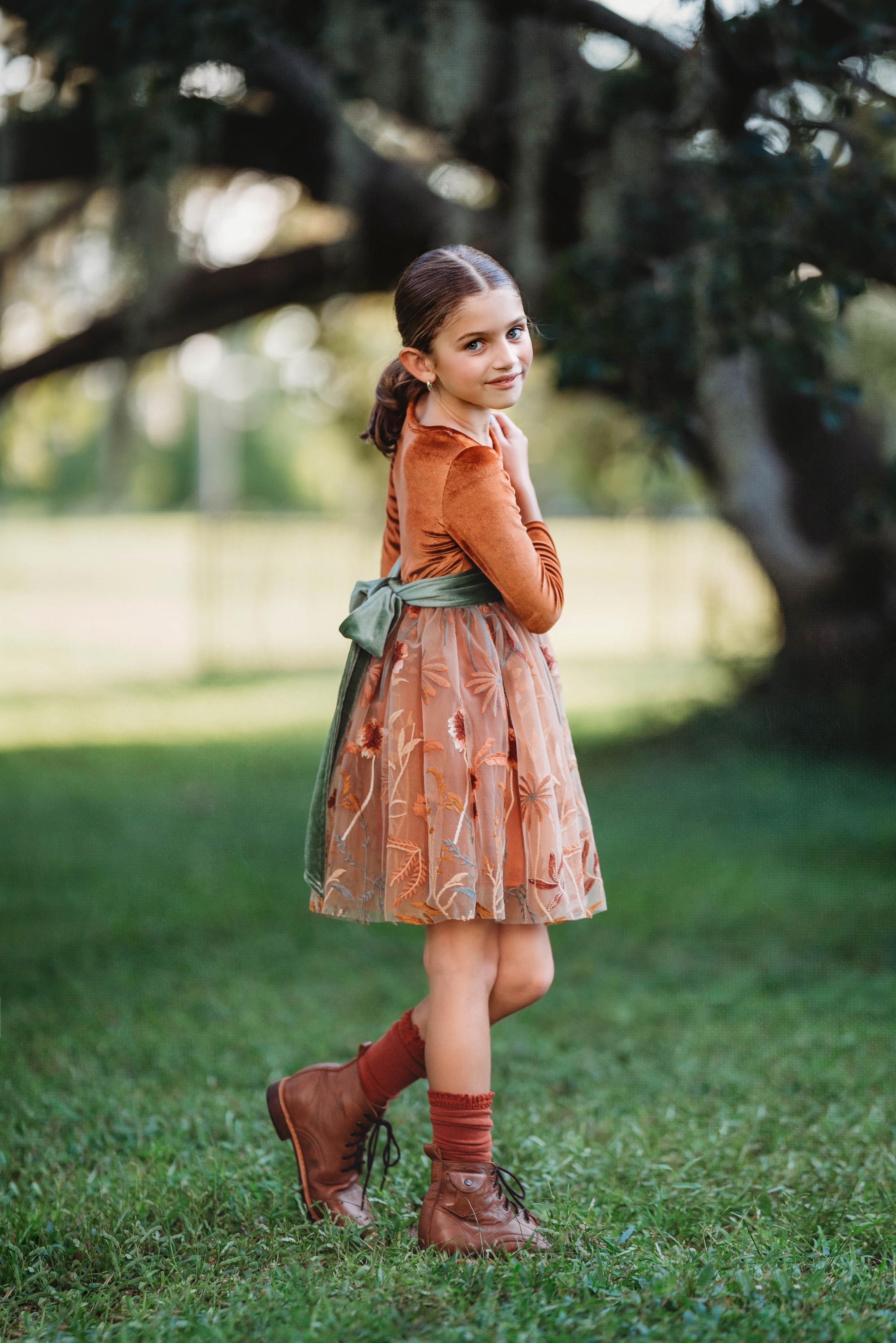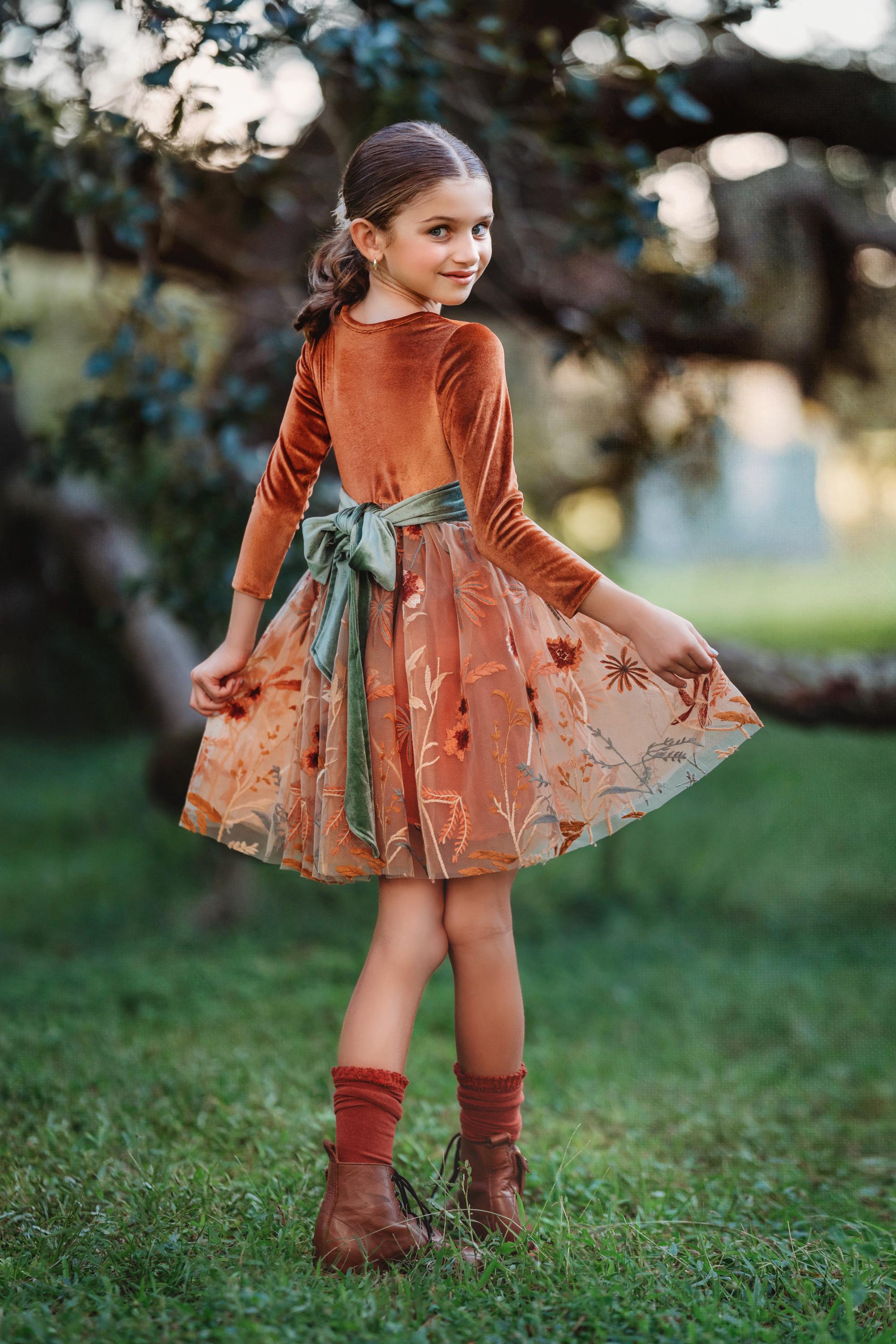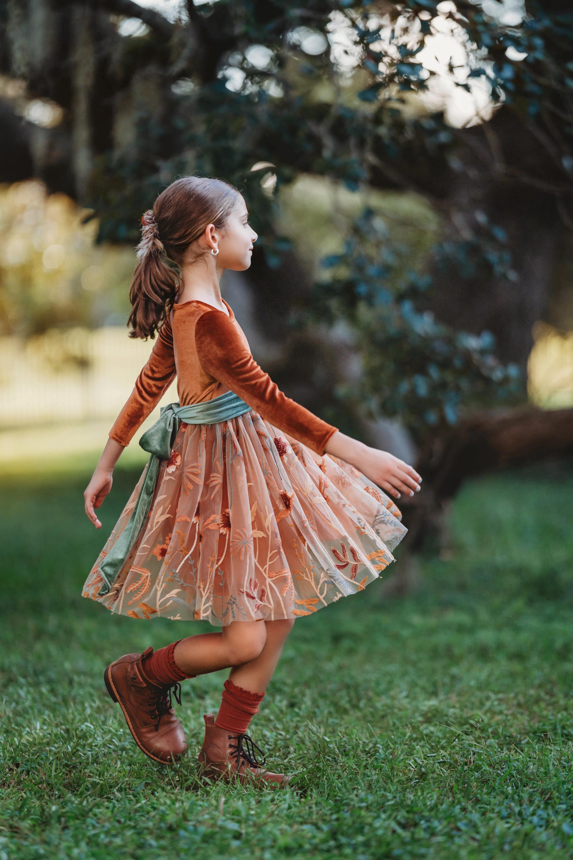 This dress features a soft, stretch velvet bodice in rich burnt orange paired with a full embroidered tulle skirt showcasing warm autumn florals. The wide sage waistband creates a beautifully shaped and comfortable fit.
