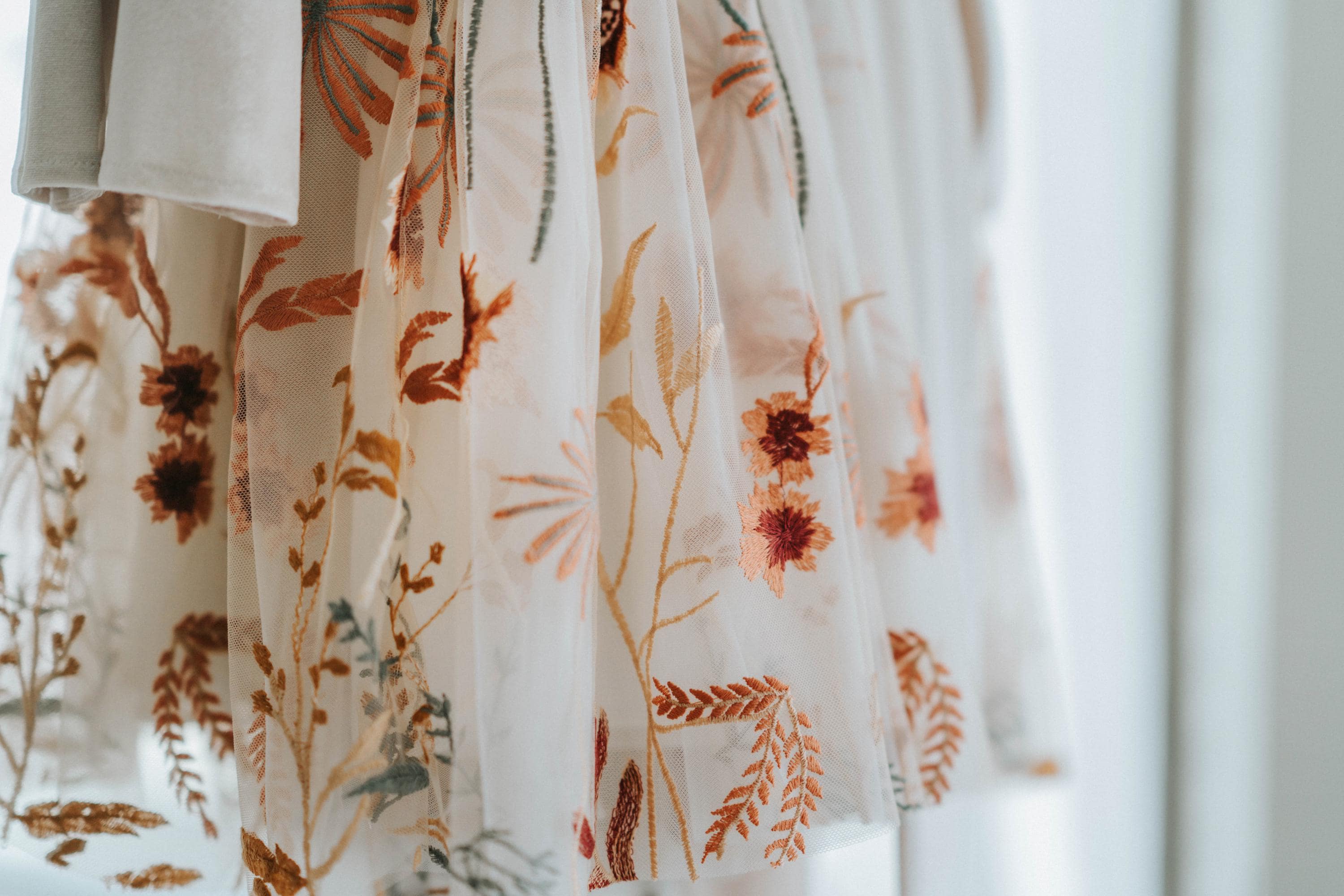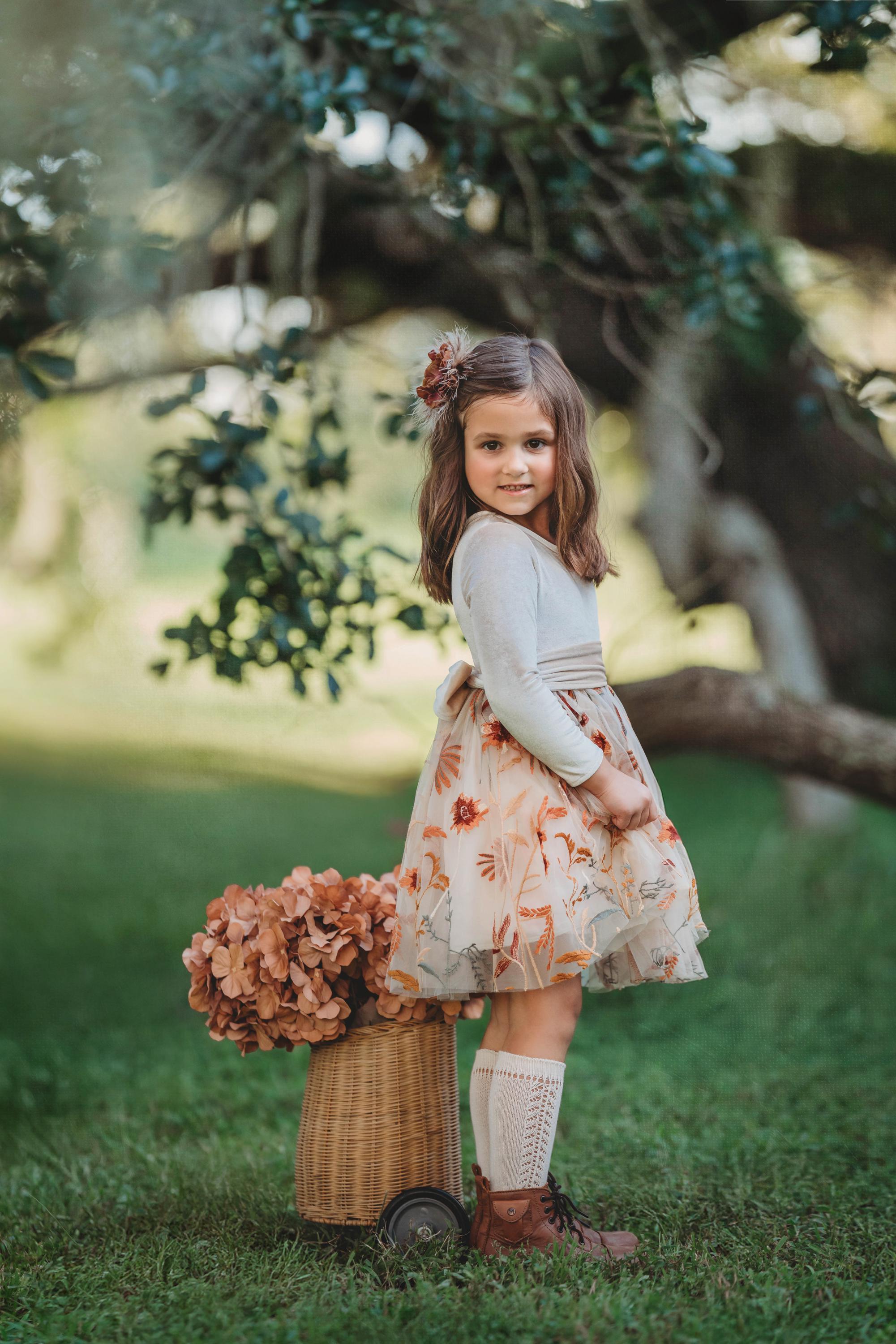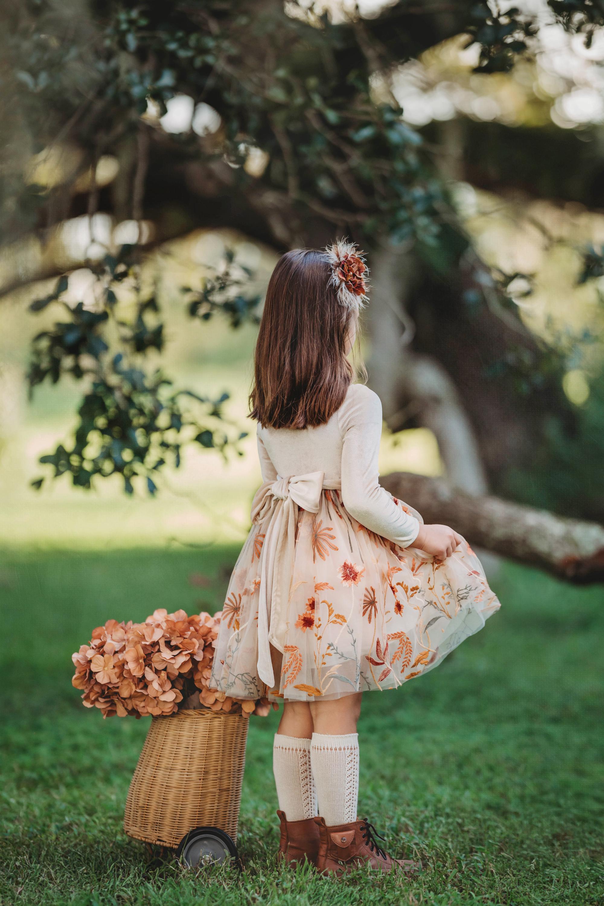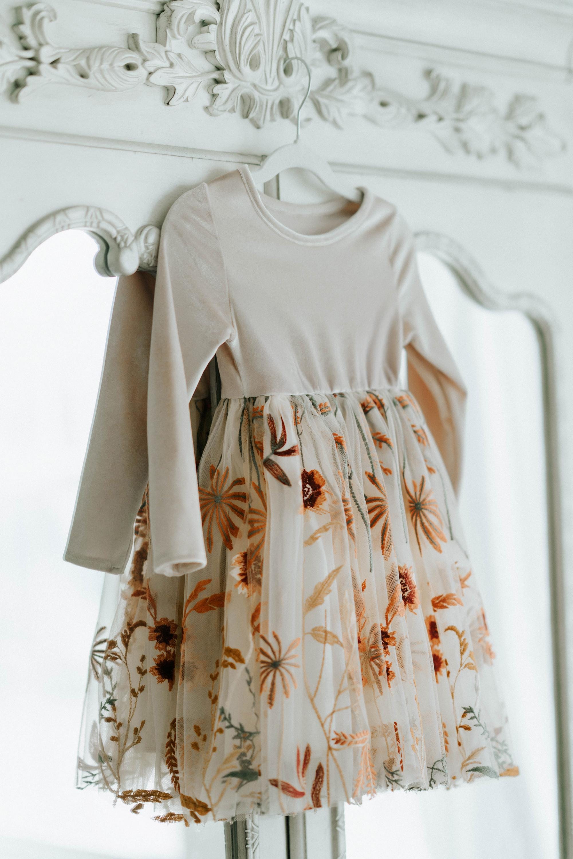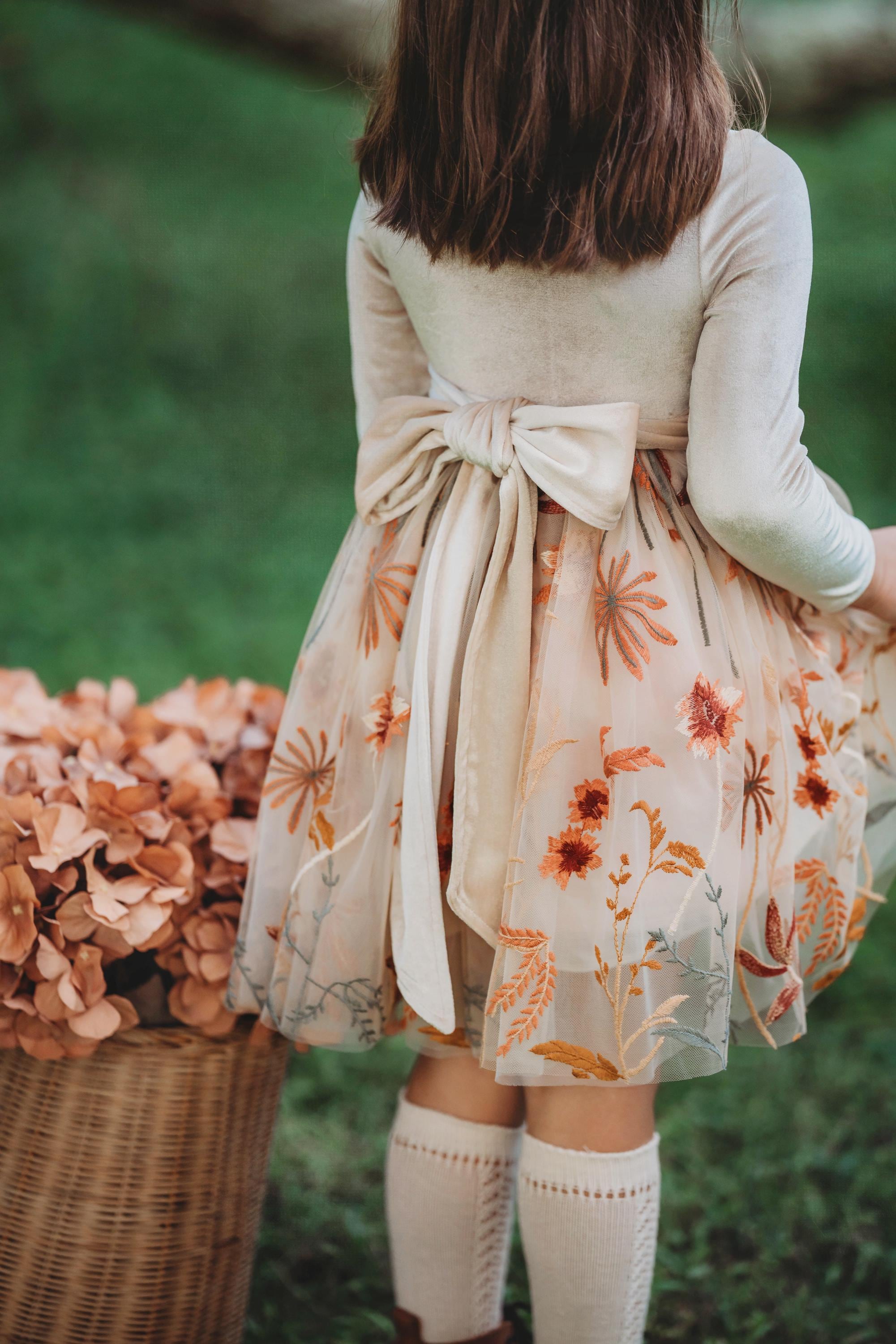 This design features a soft champagne velvet bodice paired with a fully embroidered tulle skirt in warm autumn floral tones. The wide waistband provides a comfortable and flattering fit while allowing for easy movement and twirling.