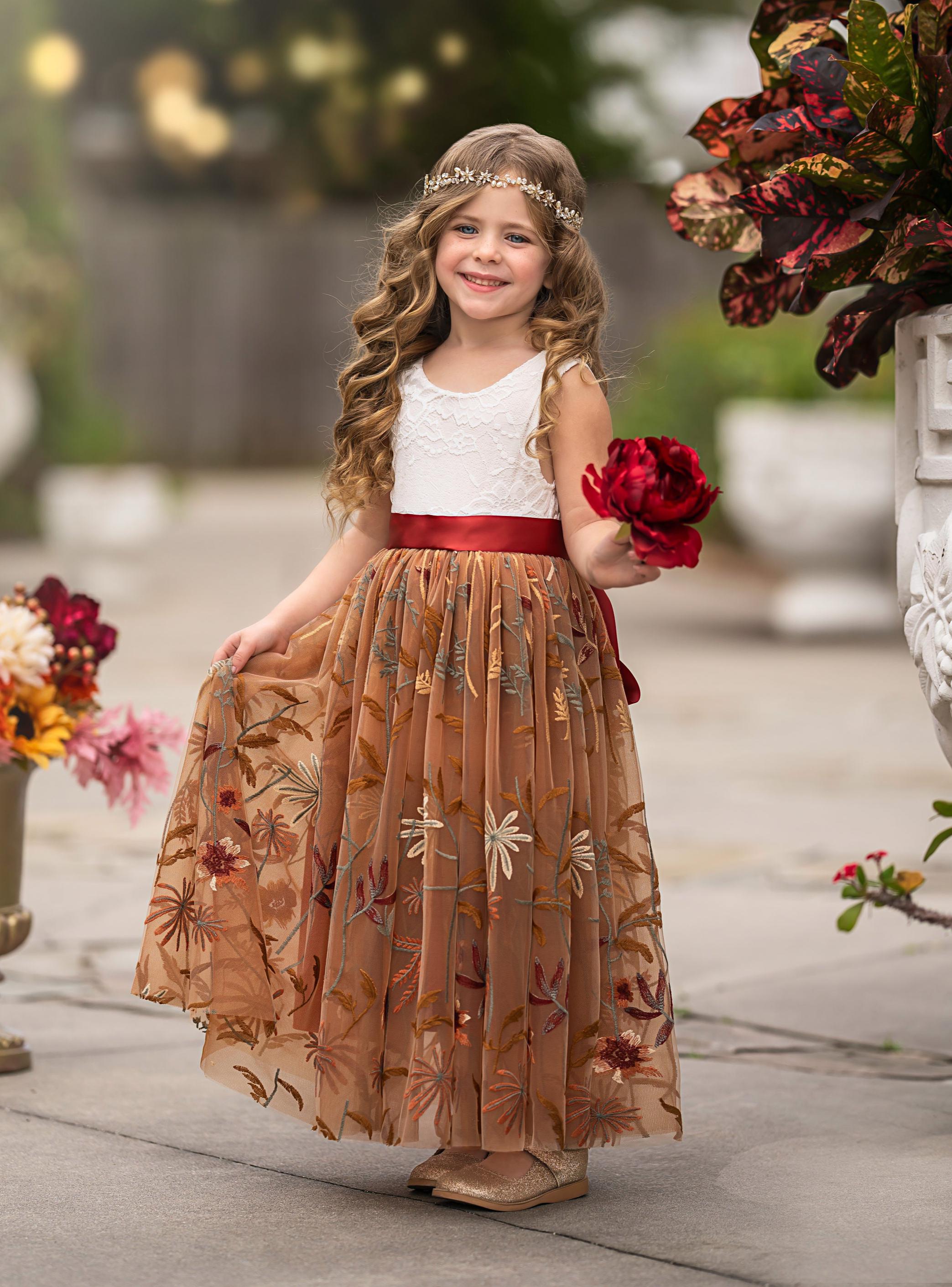 Burnt Orange Floral Flower Girl Dress for Autumn Weddings