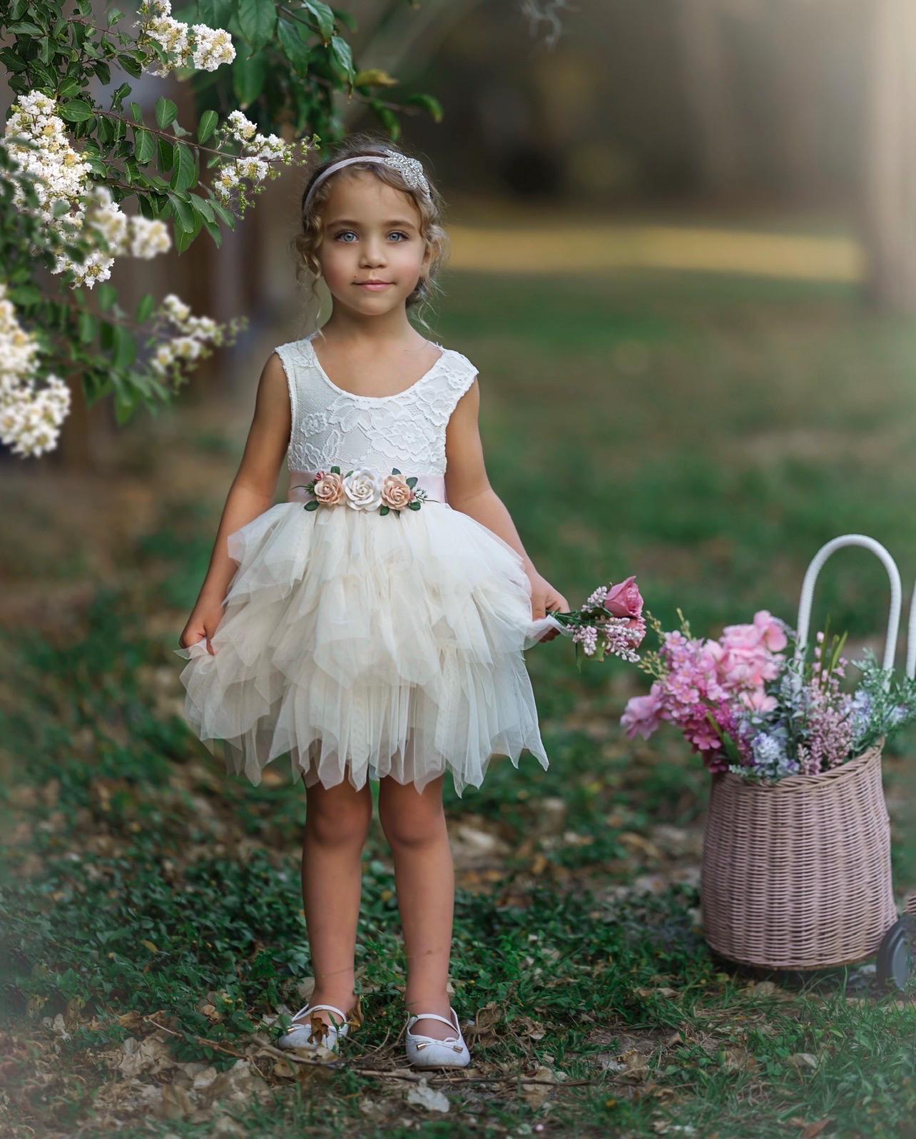 This knee-length flower girl dress features a soft warm-white lace bodice with gentle stretch for comfort, paired with a layered tulle skirt that creates beautiful movement for walking down the aisle, photos, and celebrations.