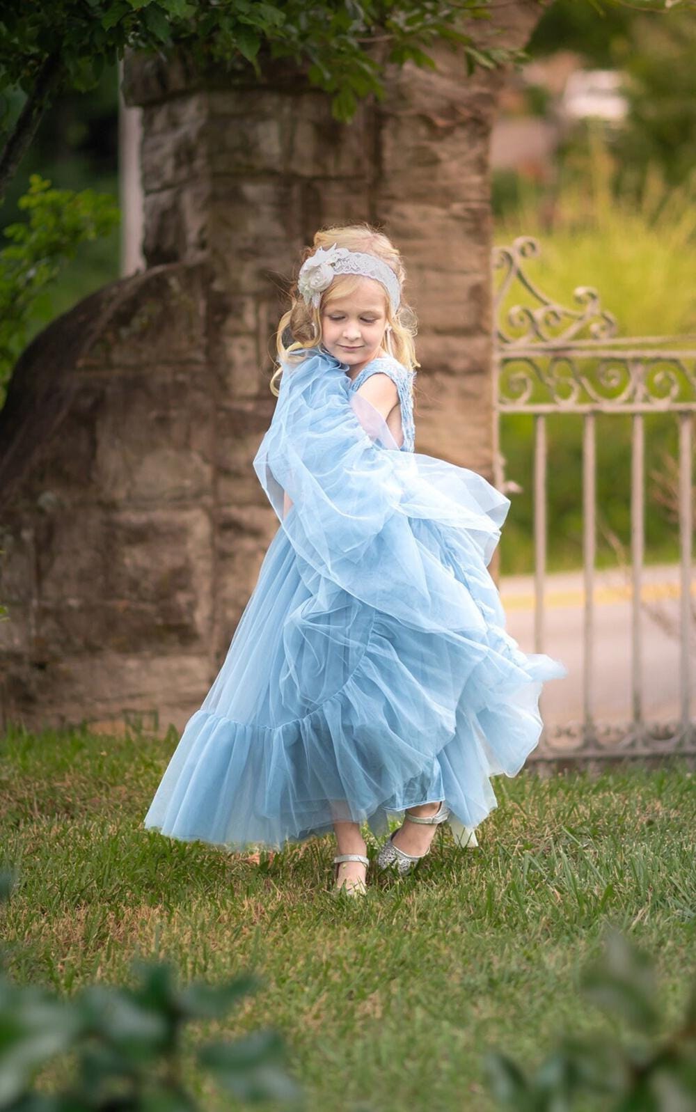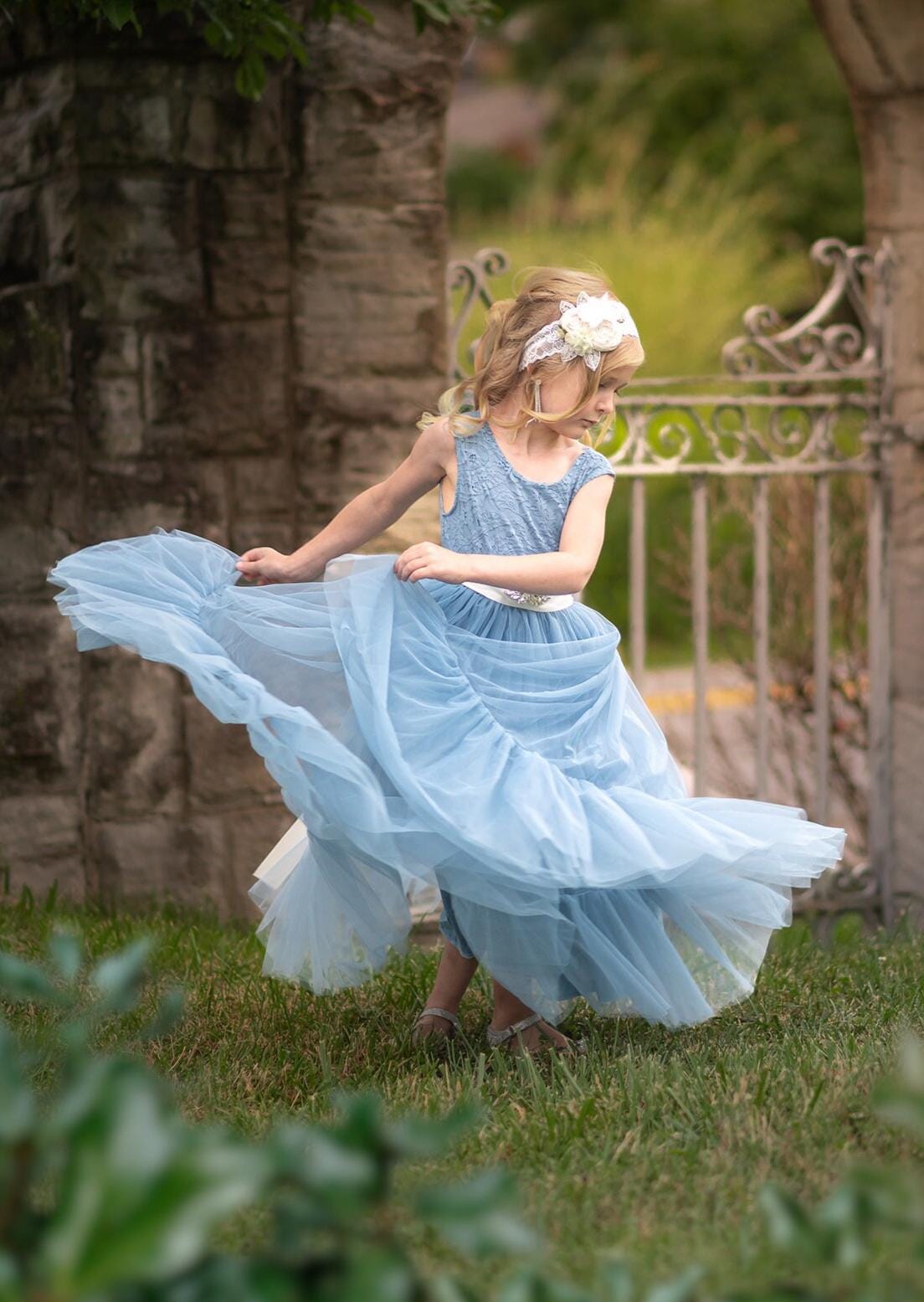 Choose from sage green or dusty blue tulle. Detachable sash options allow for personalized styling, from classic to jeweled or floral accents.