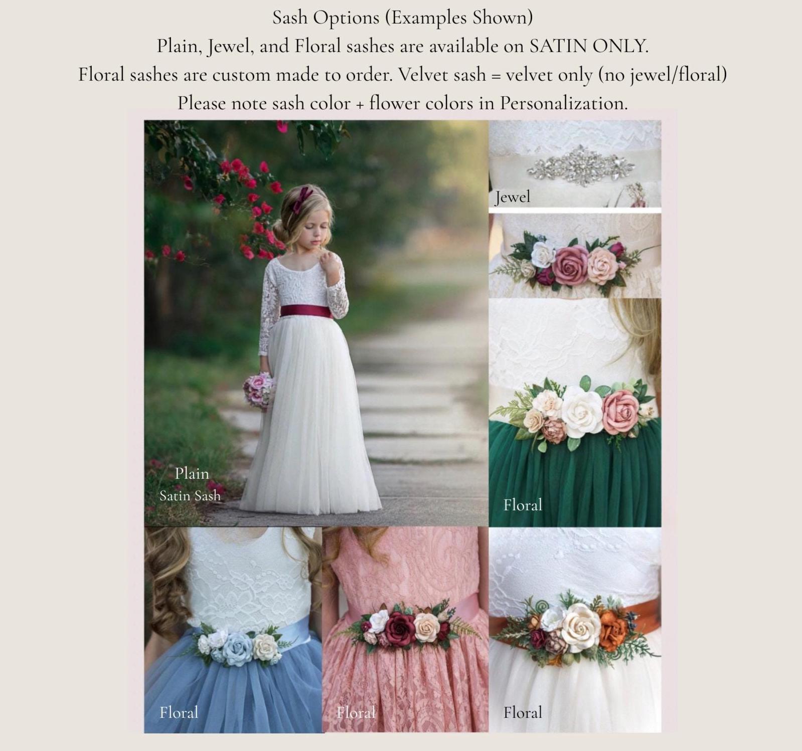 Matching hair bows, headbands, flower crowns, and tiaras are available in our shop to complete the flower girl look.