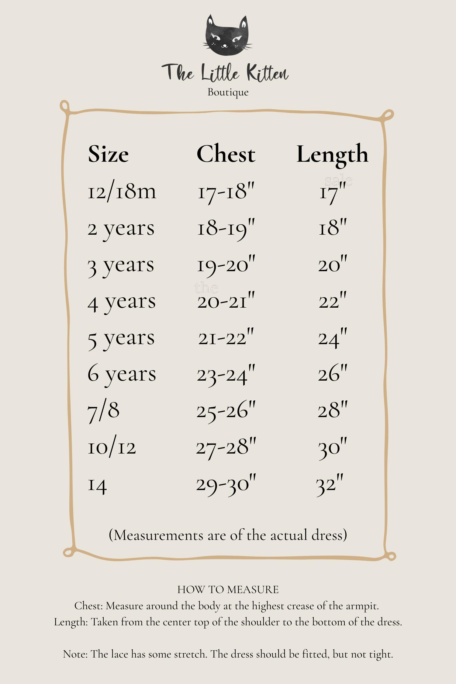 MEASUREMENT CHART: These are the Measurements of the actual dresses and should be compared to your child's chest measurement and the length should be compared against your child to see where is will fall. The length will fall differently according to height. These dresses are exchangeable for size, but any custom altering would need to be made on the part of your seamstress.