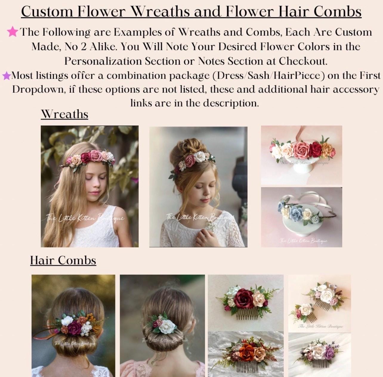 Custom floral sashes, hair wreaths, and combs along with other handmade headbands, are also pictured in the photo section and are combo selections from the first dropdown. The photo section shows examples of previous accessories I have made and other examples can be found in the links below. Our Flower opinions are very detailed and custom made to the colors and style, which we can discuss further in a message or you can simply notate colors and I will create a one of a kind piece, that will add that WOW factor to the overall look. PLEASE NOTE: These Floral Handmade accessories are one of a kind and no 2 pieces are alike. I have most colors available and also offer a variety of greenery, seasonally.