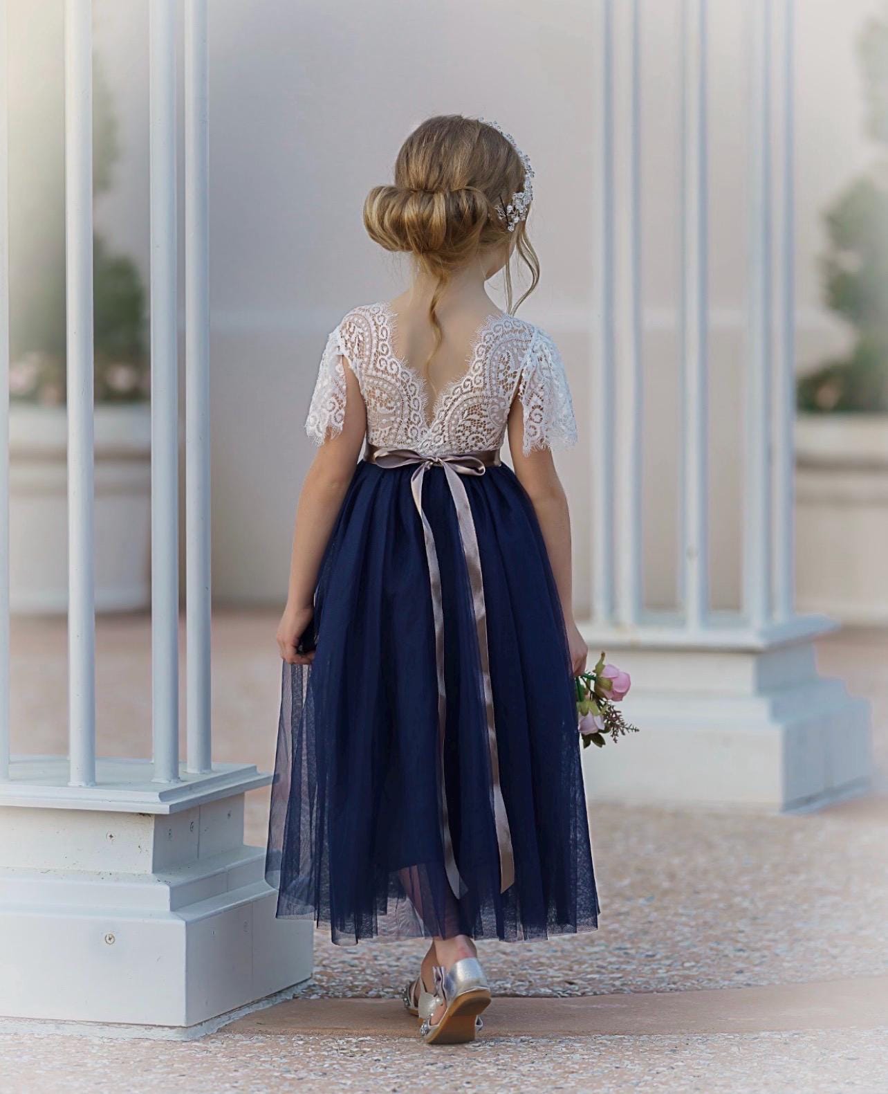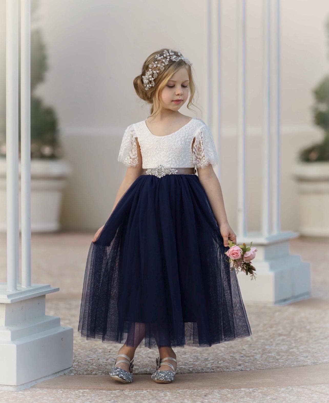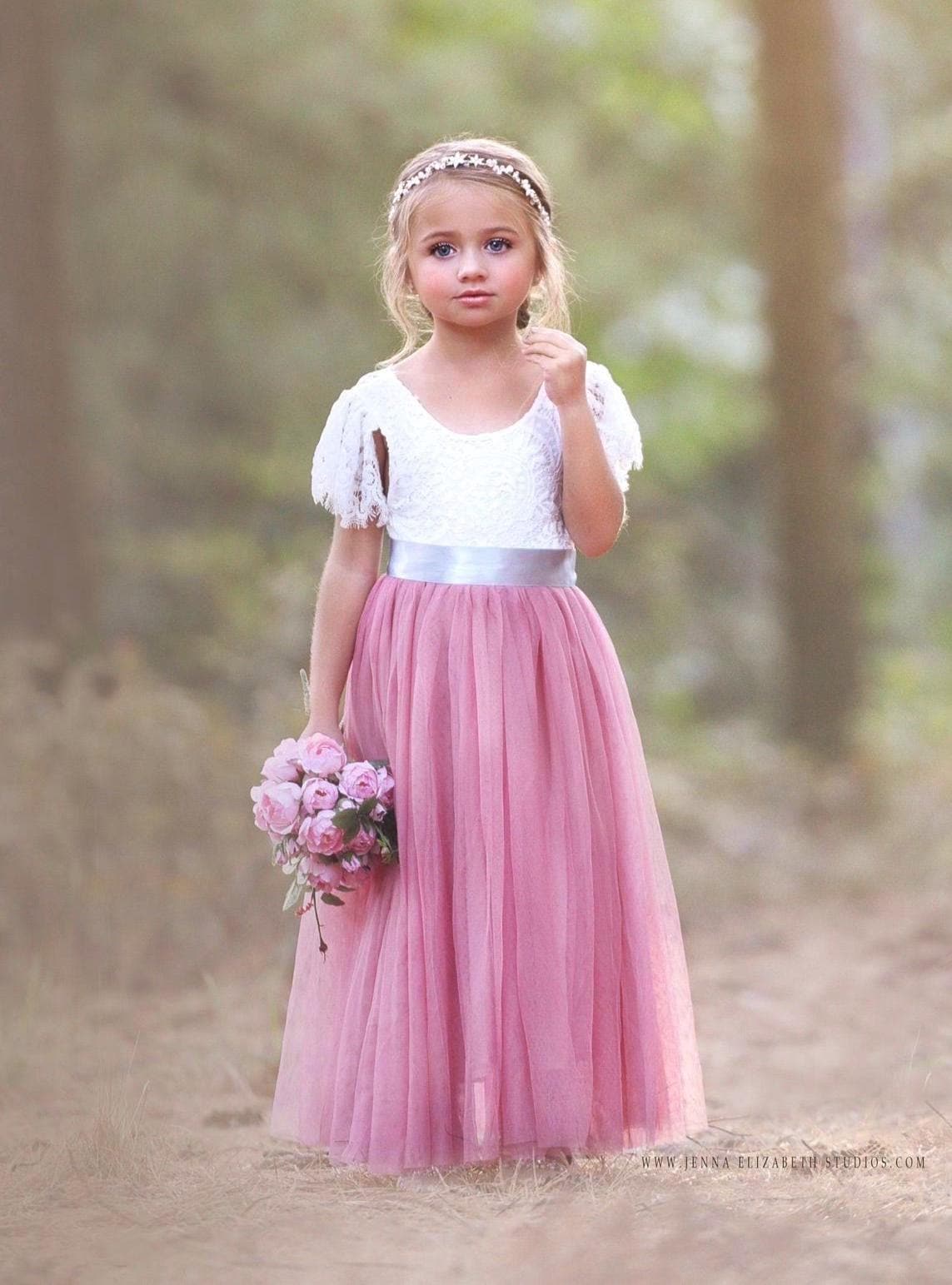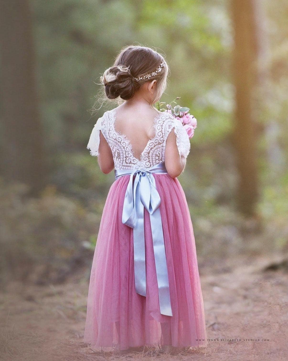 Our enchanting butterfly cap sleeve, full length, tulle and lace flower girl dress, is made with a delicate off white lace bodice and choice of (8) fully lined, tulle colors for the skirting. The V shaped back with unfinished lace adds the perfect amount of vintage charm to this dress. You have the option to choose a plain, jeweled Sash or Flower Sash which is detachable and simply ties around the waist, for reuse. You select the sash color from our color chart. The lace bodice comes in the color" soft white" only and is a barely off white, which is baby soft and has a slight stretch. While our dresses are widely used as flower girl dresses, they can also be used as communion dresses, baptism dresses, birthday dresses, beach photo shoots, tea parties, daddy daughter dances dresses and family photos.