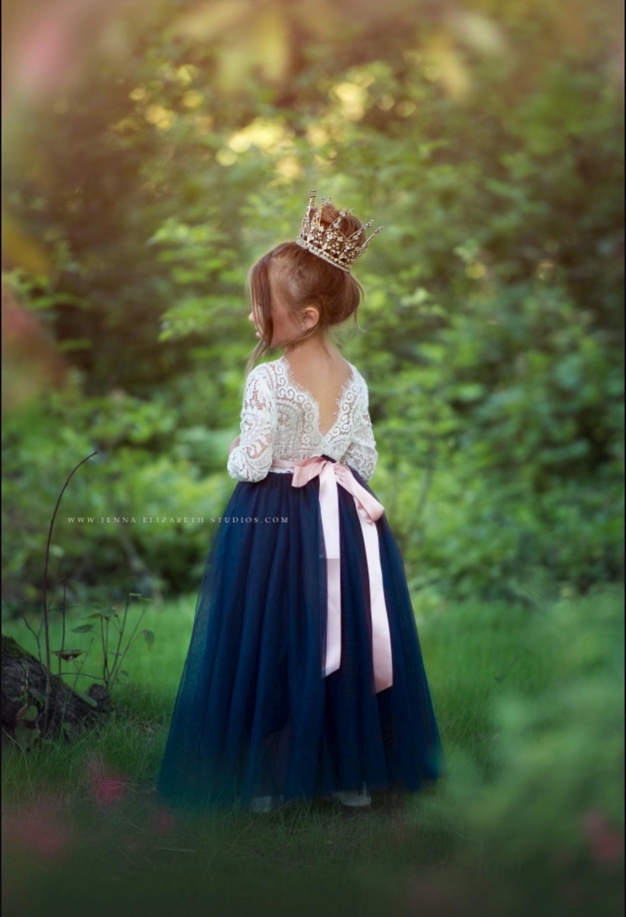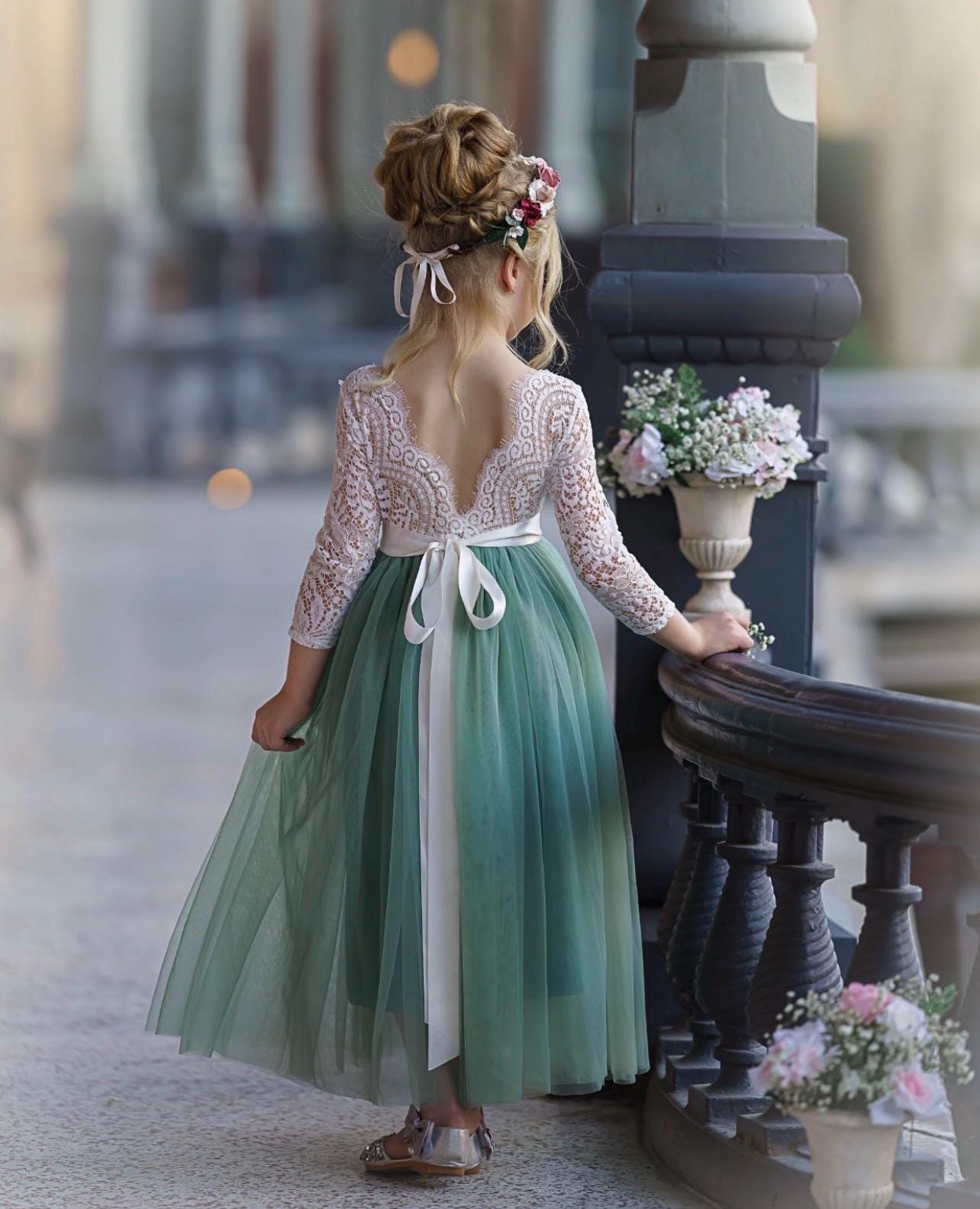 Our enchanting full length flower girl dress, is made with a delicate white lace bodice and choice of (14) fully lined, tulle colors for the skirting. The V shaped back with unfinished lace adds the perfect amount of boho chic look to this amazing dress. With 3/4 long length sleeves this dress is versatile for any season. You have the option to choose a plain, jeweled Sash or Flower Sash which are options on the first dropdown. All sashes are detachable and simply tie around the waist. You select the sash color from our color chart. The lace bodice comes in the color" soft white" only and is a barely off white, which is baby soft and has a slight stretch. Off white is the only color this lace is offered in. While our dresses are widely used as flower girl dresses, they can also be used as communion dresses, baptism dresses, birthday dresses, daddy daughter dances dresses, for photo shoots and family photos.