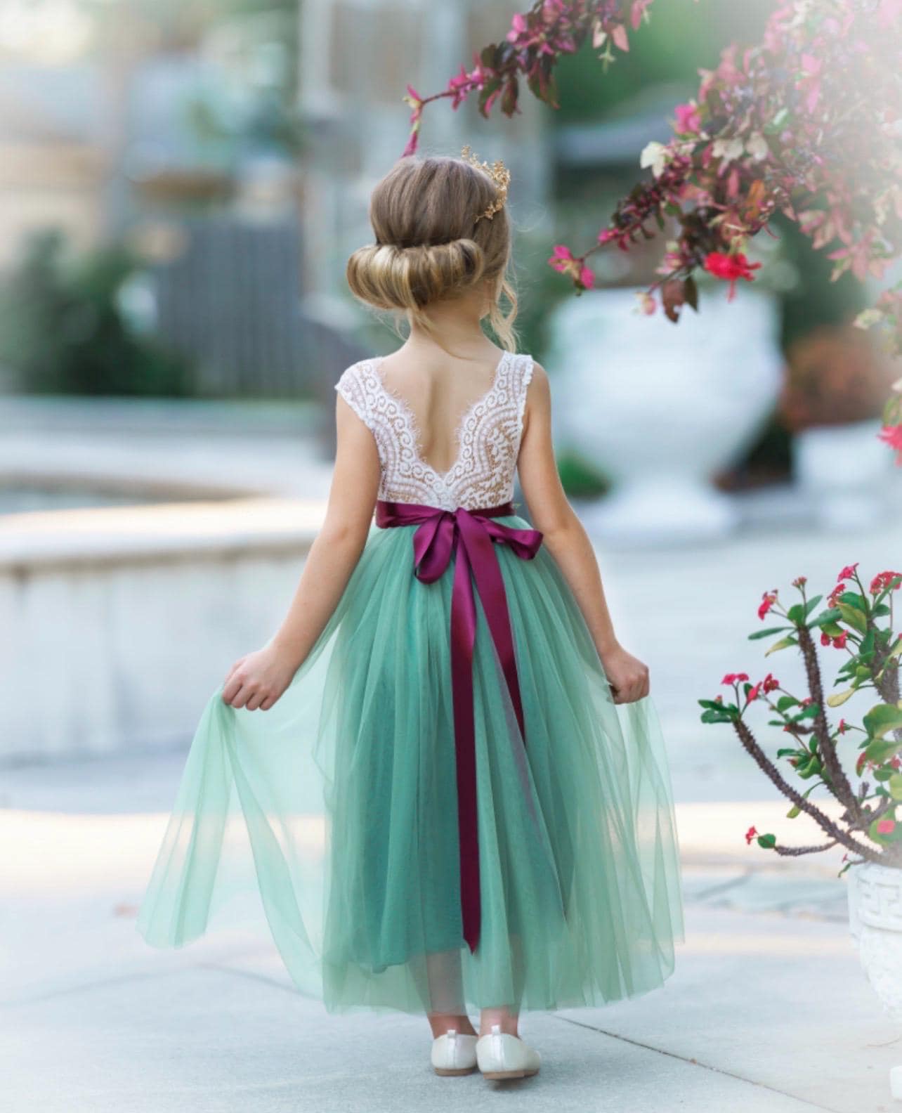 Our sweetest fairytale sleeveless flower girl dress has a "soft white" lace bodice (which is a slightly off white and the only color offered for the lace) and bridal grade tulle and is available in several colors. The "V" shaped backside makes this dress stand out with its delicate scalloped unfinished eyelash lace trim. Our sashes comes in 3 styles: a plain sash, jeweled sash or a flower sash and these options are located to select on the first dropdown. Customize your sash with your choice of color from the chart located within the photo section. You will notate this color in the personalization section. You also have the option to add a variety of hair pieces to complete the look. links and SIZE chart below