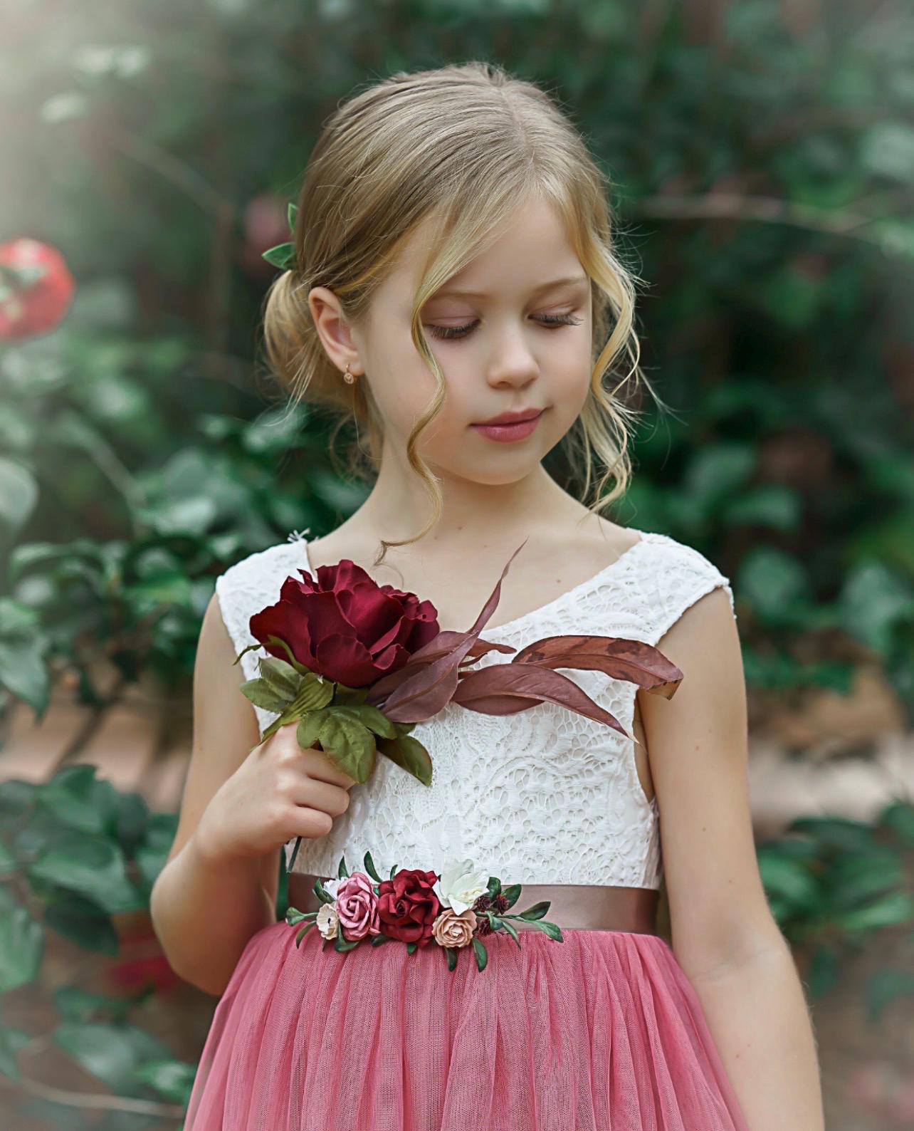 **Please notate sash color and /or flower colors in the personalization section. Ginger Snap satin sash is pictured with the dusty rose dress in this listing.