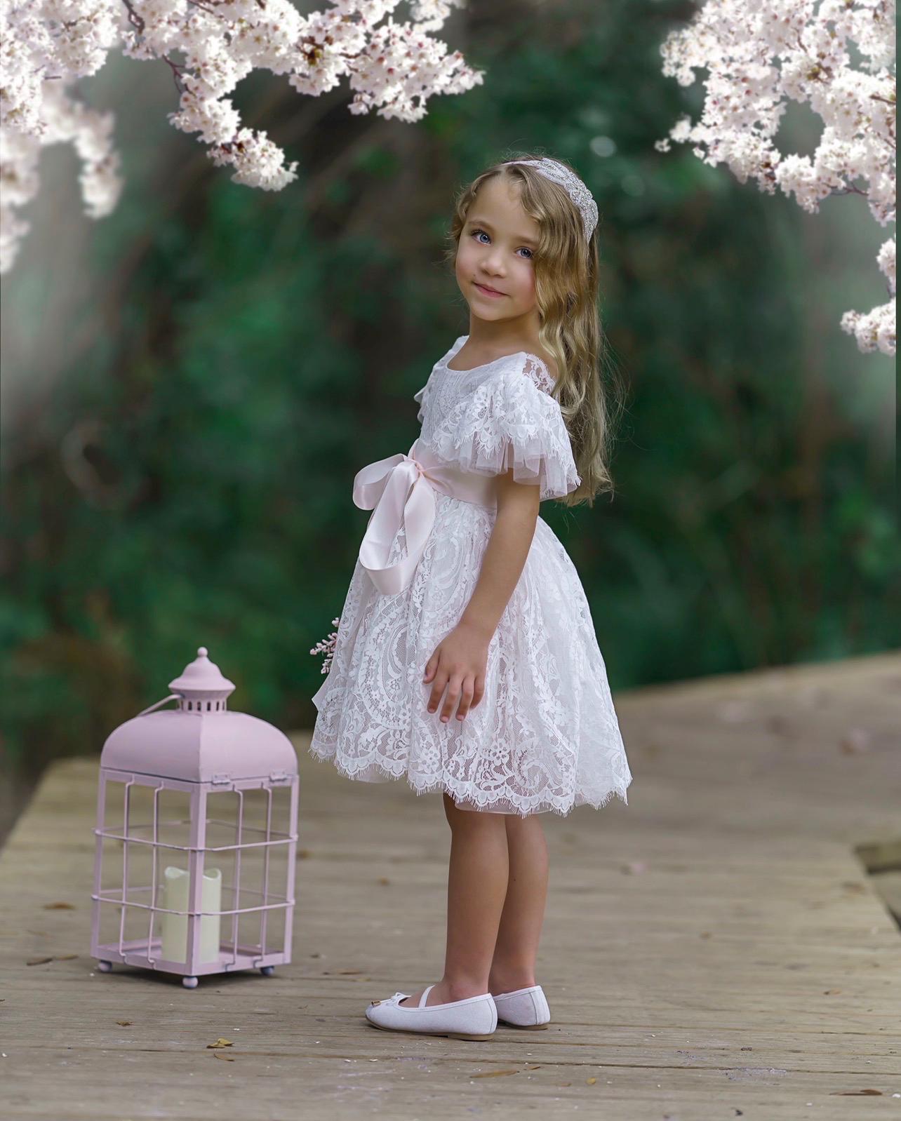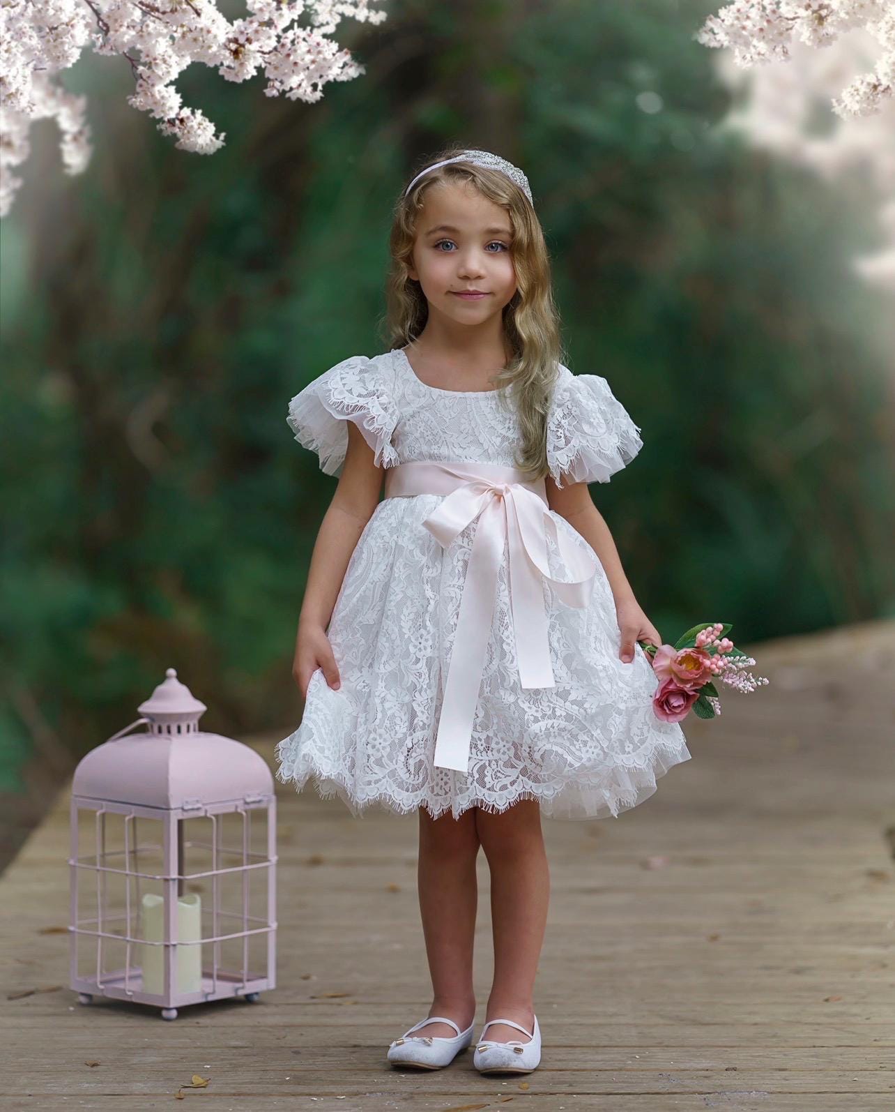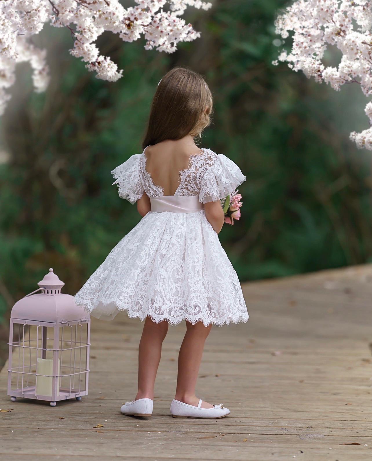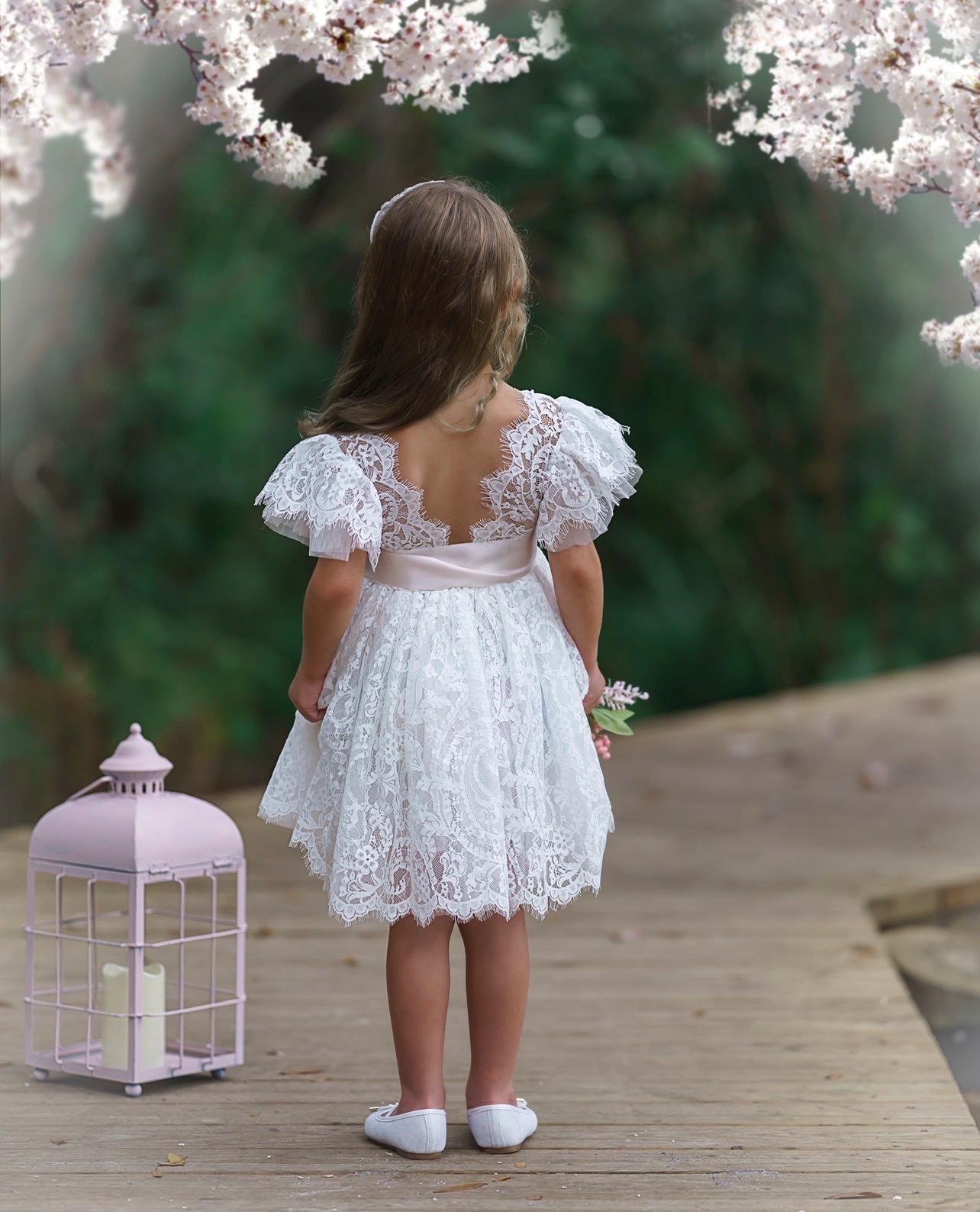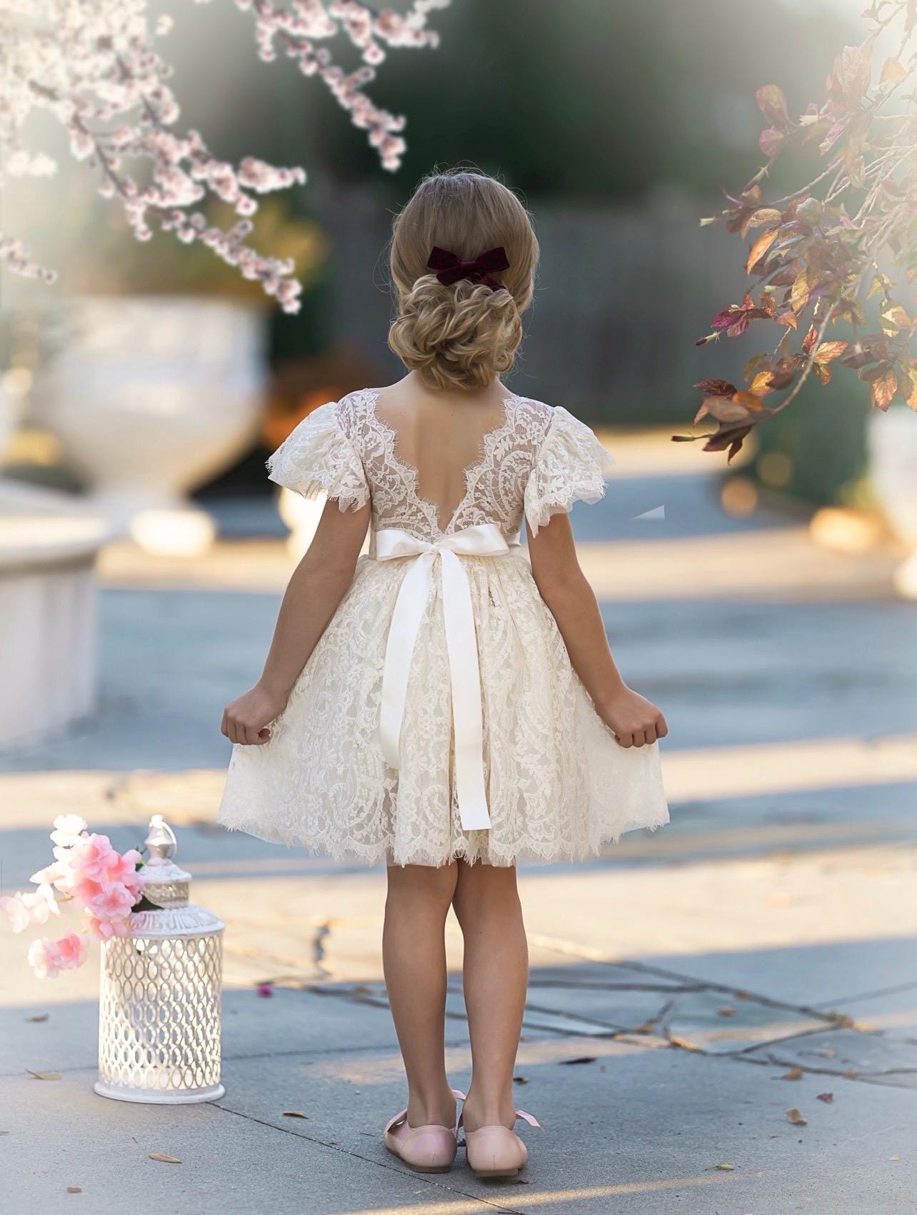 Our enchanting knee length, bohemian inspired, ruffle sleeve, flower girl dresses are sure to turn heads. Made with a beautiful, paisley patterned lace fabric, which is fully lined and the sweetest lace and tulle ruffle sleeves. Which is available in White and Antique Ivory lace. The V shaped backside, is edged with eyelash lace which adds a bit of whimsy to this beautiful dress. While our dresses are widely used as flower girl dresses, they can also be used as communion dresses, baptism dresses, birthday dresses, daddy daughter dances dresses, for photo shoots and family photos.