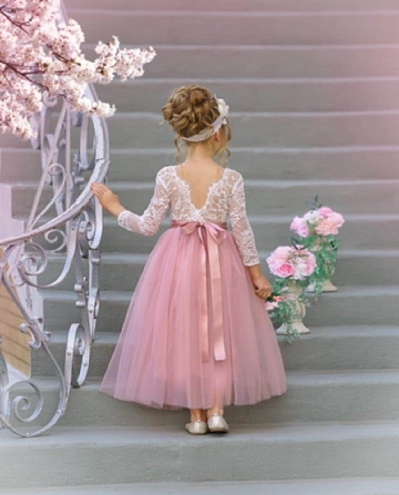 We are welcoming wedding season with our new Long Sleeve style flower girl dresses available in Forest Green Tulle, Mauve Tulle or Prima Pink Tulle. Our whimsical bohemian style special occasion dresses are are widely used as flower girl dresses, but are also the perfect: birthday dress, dress for photo shoot and also makes a great communion dress or baptism dress. The soft, off white bodice is made of stretch lace and lined with cotton for comfort. The "V" shaped backside is jaw dropping, edged with delicate eyelash lace to complete a classic style dress. The skirting is made with bridal grade tulle and also lined. You can not go wrong with this dress.