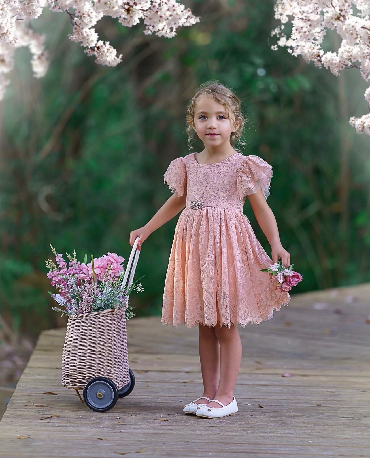Our enchanting knee length, bohemian inspired, ruffle sleeve, flower girl dresses are sure to turn heads. Made with a beautiful, paisley patterned lace fabric, which is fully lined and the sweetest lace and tulle ruffle sleeves. Which is available in White, and Antique Ivory lace. The V shaped backside, is edged with eyelash lace which adds a bit of whimsy to this beautiful dress. While our dresses are widely used as flower girl dresses, they can also be used as communion dresses, baptism dresses, birthday dresses, daddy daughter dances dresses, for photo shoots and family photos.